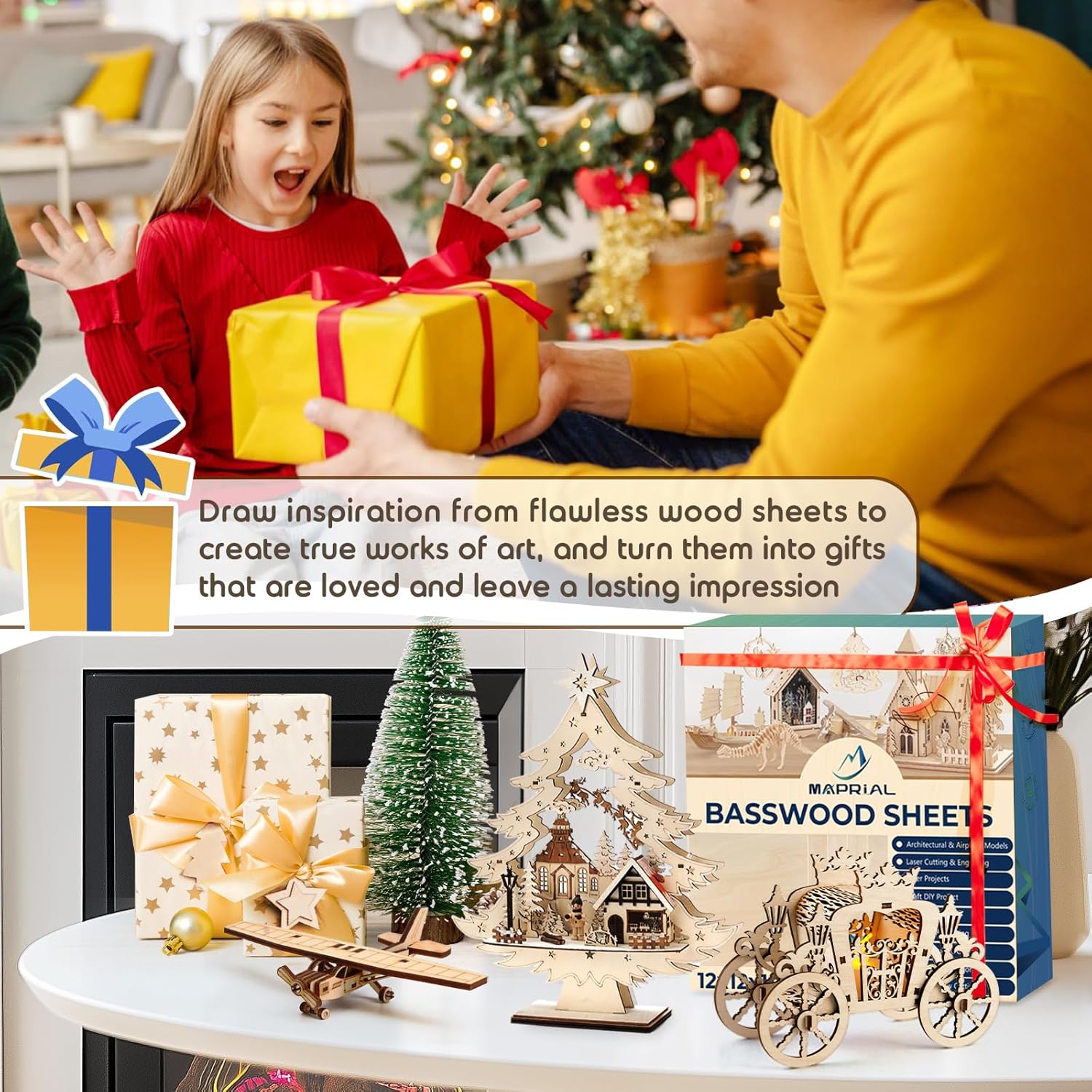 12 Pack 12x18x1/8 Inch Basswood Sheets, MAPRIAL Smooth 3mm Plywood for Laser Cutting, Unfinished Wood Board for Engraving, Wood Burning, Painting, Crafts, Ornaments, Models, Cutter, Engraver, Gifts