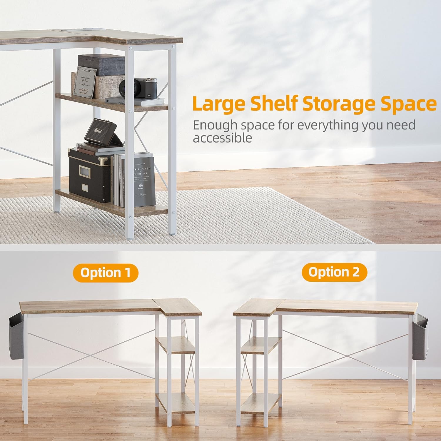 - Small Desk with Spacious Storage - The small desk offers 2-tier under desk opening shelves to help organize books and files, yet its small size and corner design fits perfectly into corner space, which is a perfect solution to maximize limited workspace.