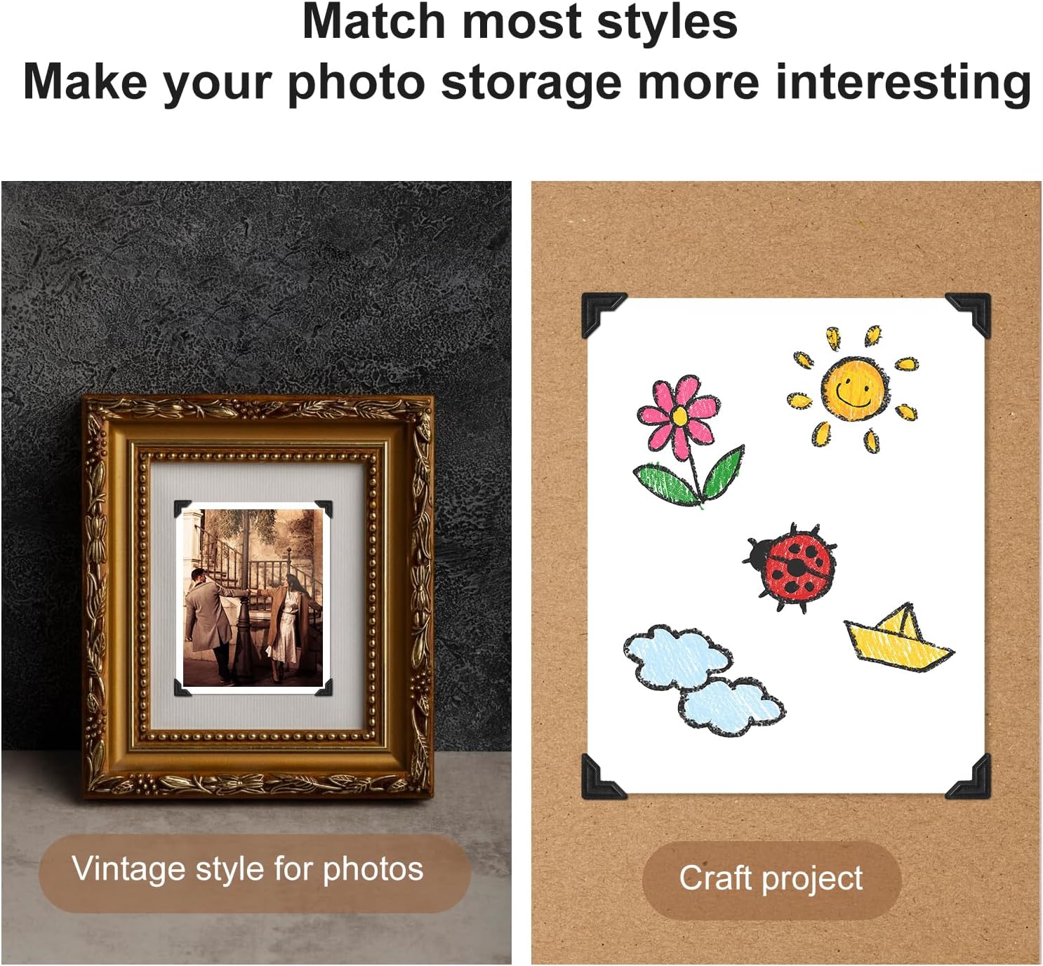 - 5. WIDE RANGE OF USE: These photo mounting corners are suitable for decorating photo album, DIY scrapbooks, picture frames, cards, handmade albums, memory books, photo walls, personal journal and diary, cards, invitations, craft project etc. The classic black color complements most styles, making it easy to achieve a vintage look for your photos. Enhance your photo storage with creativity