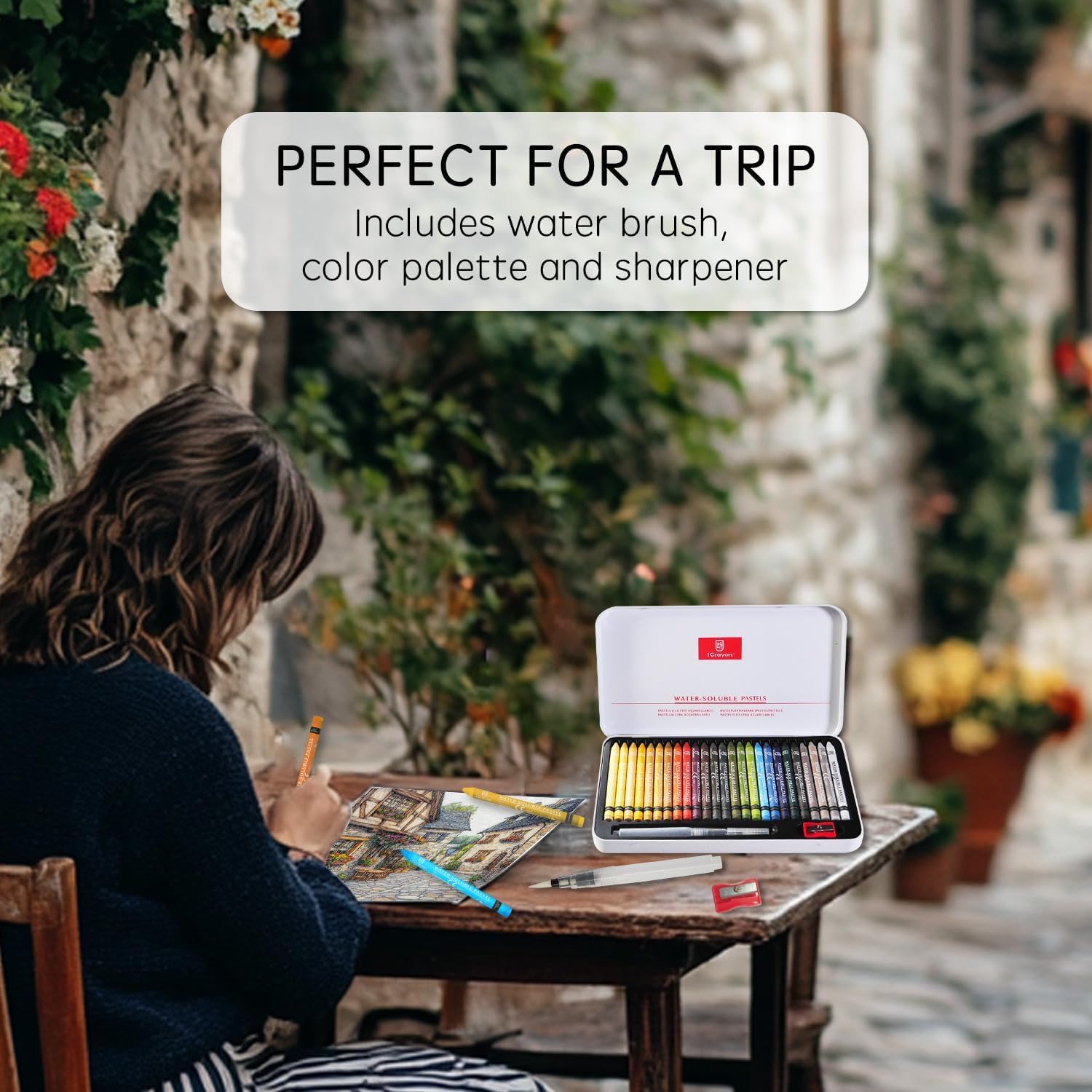 25 Colors Water Soluble Pastels, Watercolor Pastels Set for Beginners and Hobbyists, Includes Sharpener, Palette & Brush for Vibrant Art Creations (Europe)