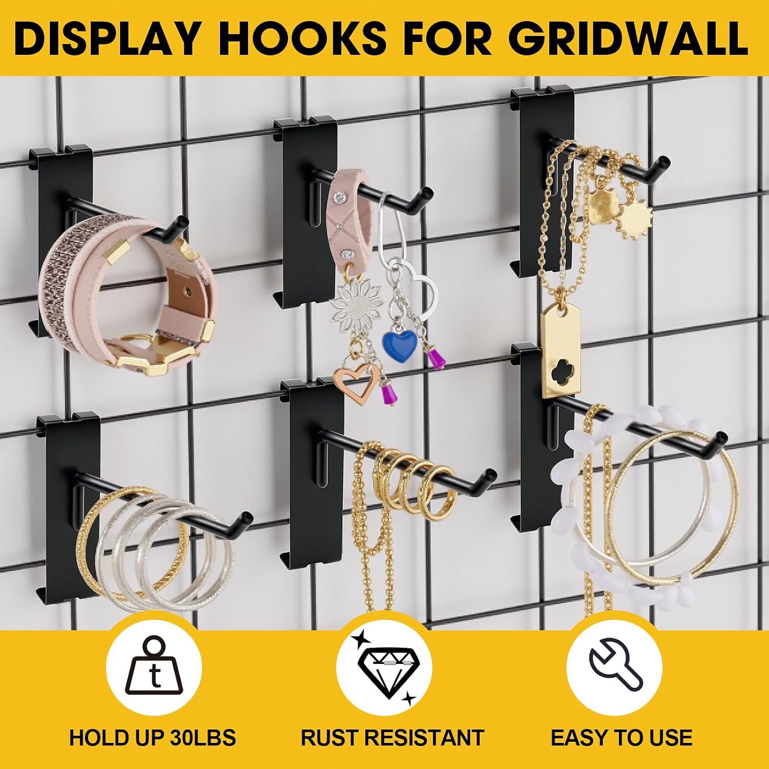 - PREMIUM MATERIAL: The gridwall hooks are made ofhigh-quality metal material, lasting for years without bending. Finished by black oxidation coating, the display hooks provides resistance to rust and corrosion. Hold up to 30 lbs.