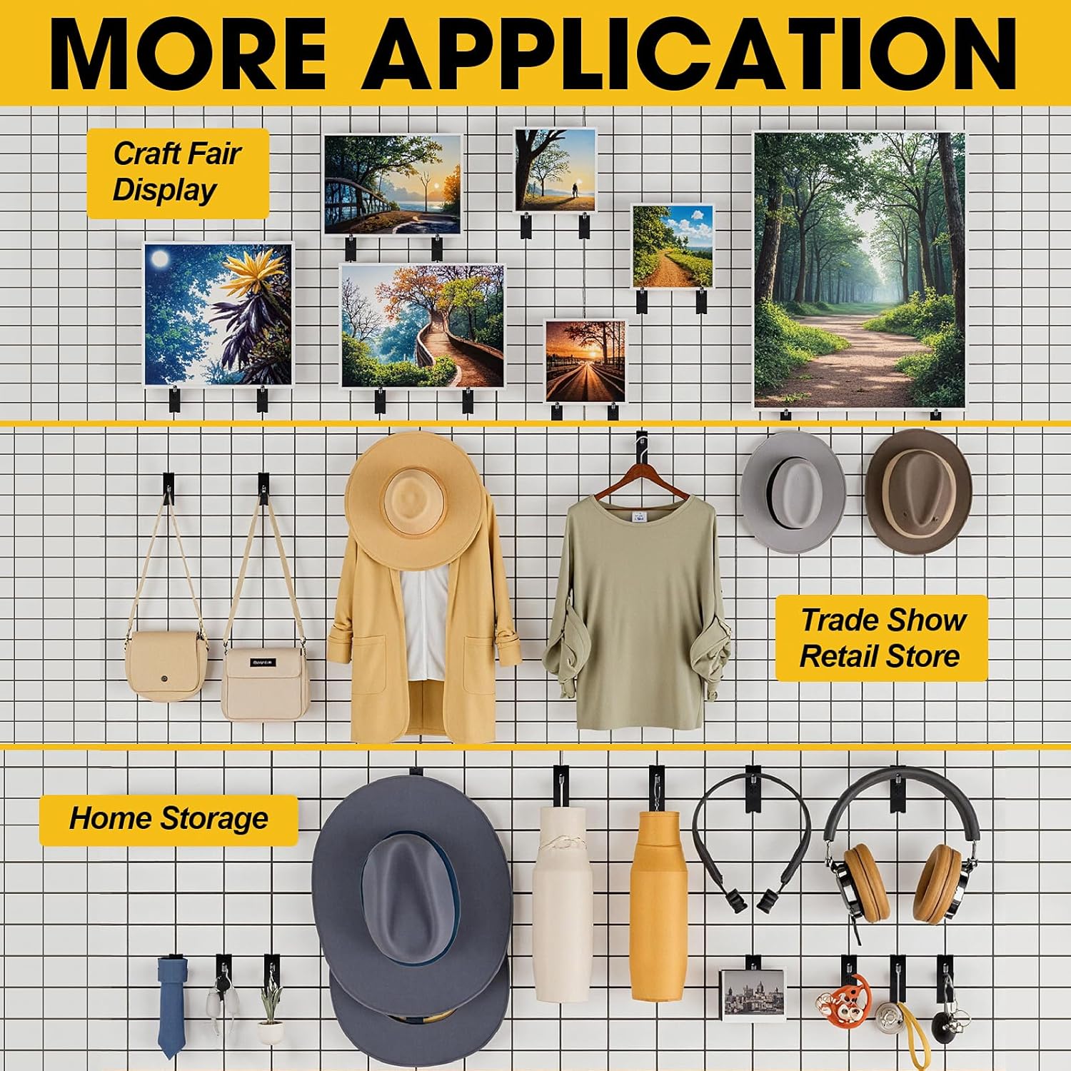 - EASY TO USE: Our display hooks are compatible with standard 3x3 inch grid walls for easy installation and versatility. Whether you need to hang clothes, photos or paintings, these hanging hooks provide a practical and space-saving solution for your grid walls & fixtures.