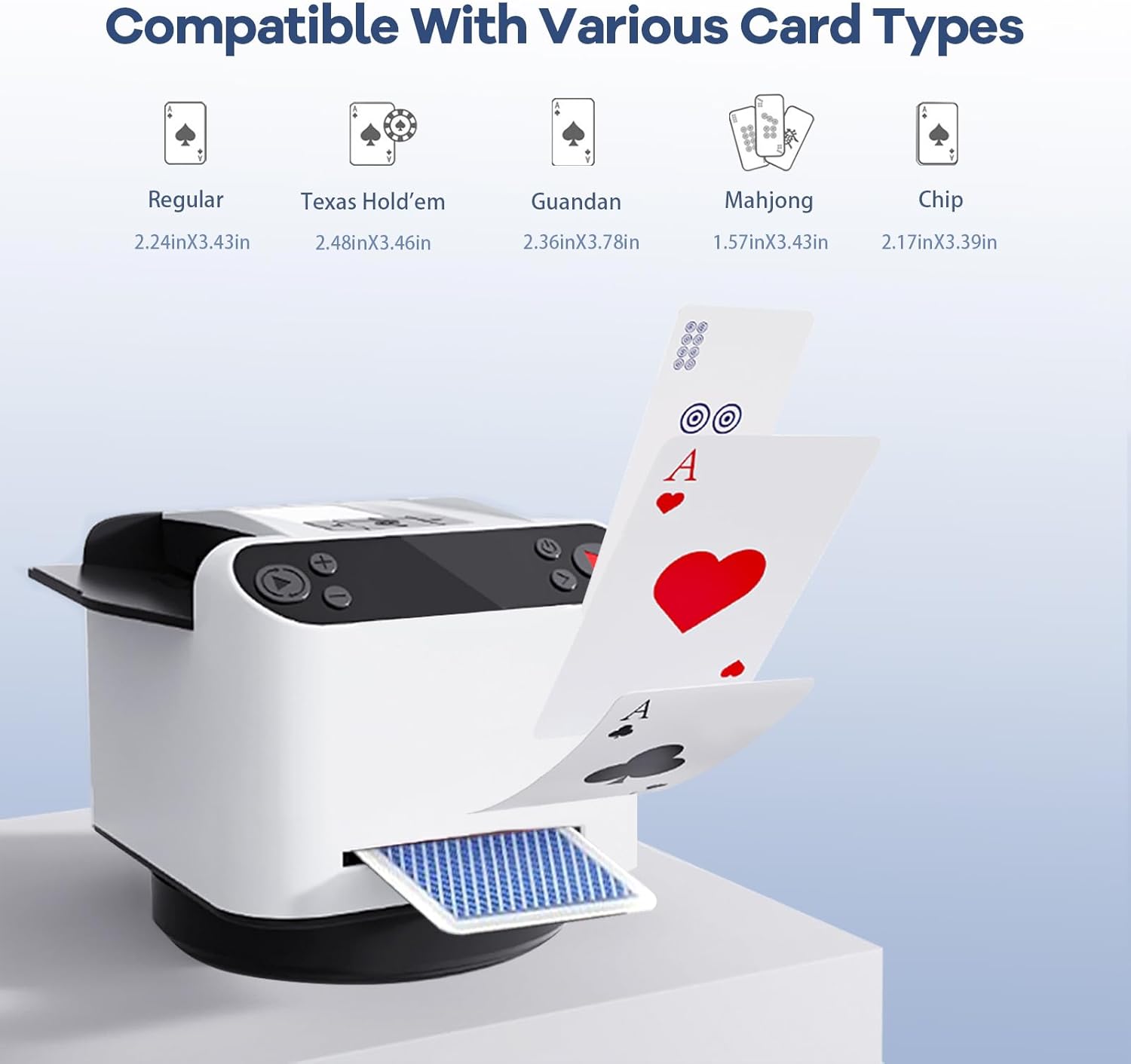 - Efficient 2-in-1 Design: This KNEBAD Automatic Card Shuffler and Dealer 2-in-1 cleverly combines two key functions. With just one press, the machine will quickly and evenly shuffle the cards automatically, and then deal the cards according to the number and direction you set. It truly frees your hands and allows you to enjoy the fun of card game night