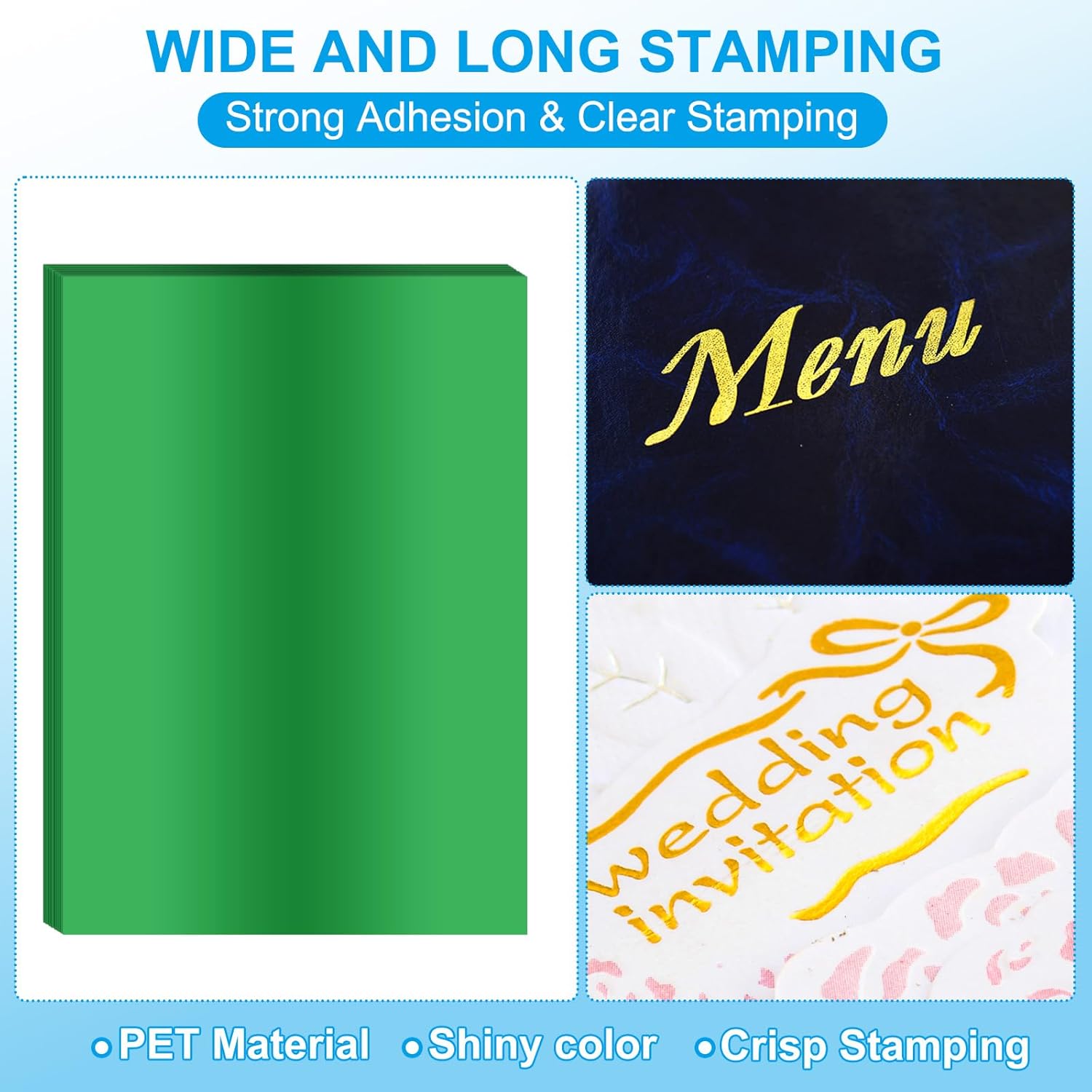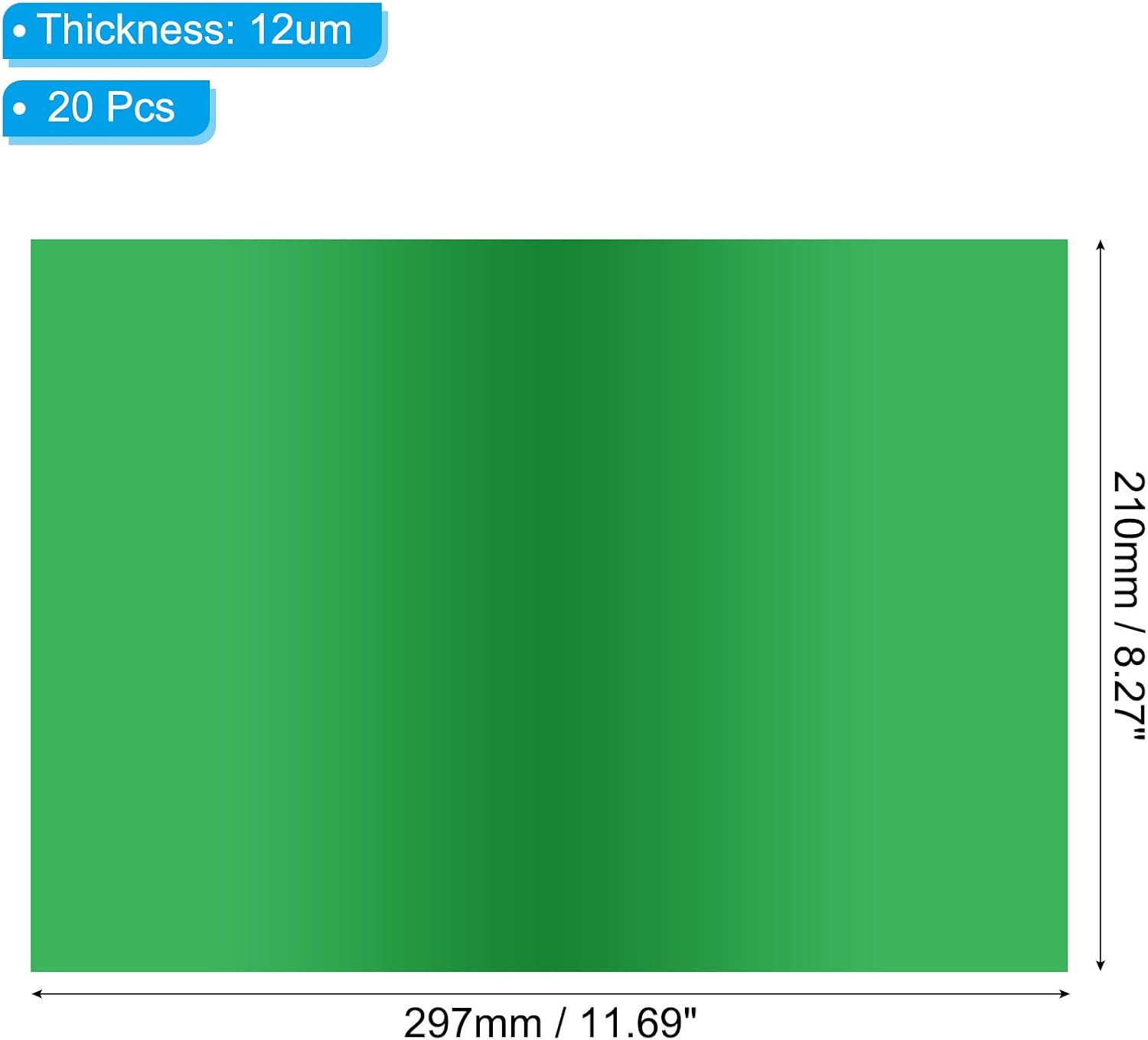 - Specification: Color: Green; Size: 297 x 210mm / 11.69 x 8.27 inch (L*W); Paper Thickness: 12um; Material: PET Plastic; Packing list: 20 Sheets x Hot stamping foil paper