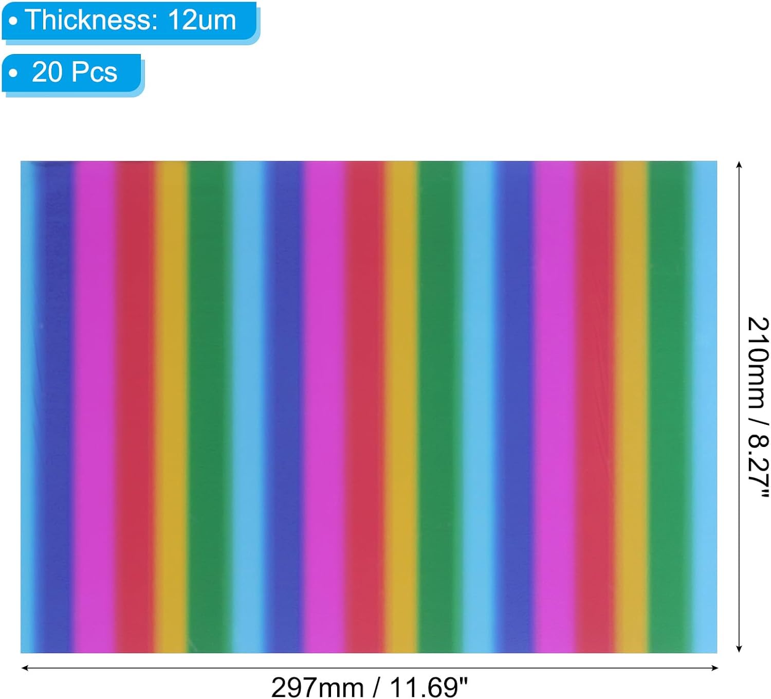 - Specification: Color: Horizontal Colorful; Size: 297 x 210mm / 11.69 x 8.27 inch (L*W); Paper Thickness: 12um; Material: PET Plastic; Packing list: 20 Sheets x Hot stamping foil paper