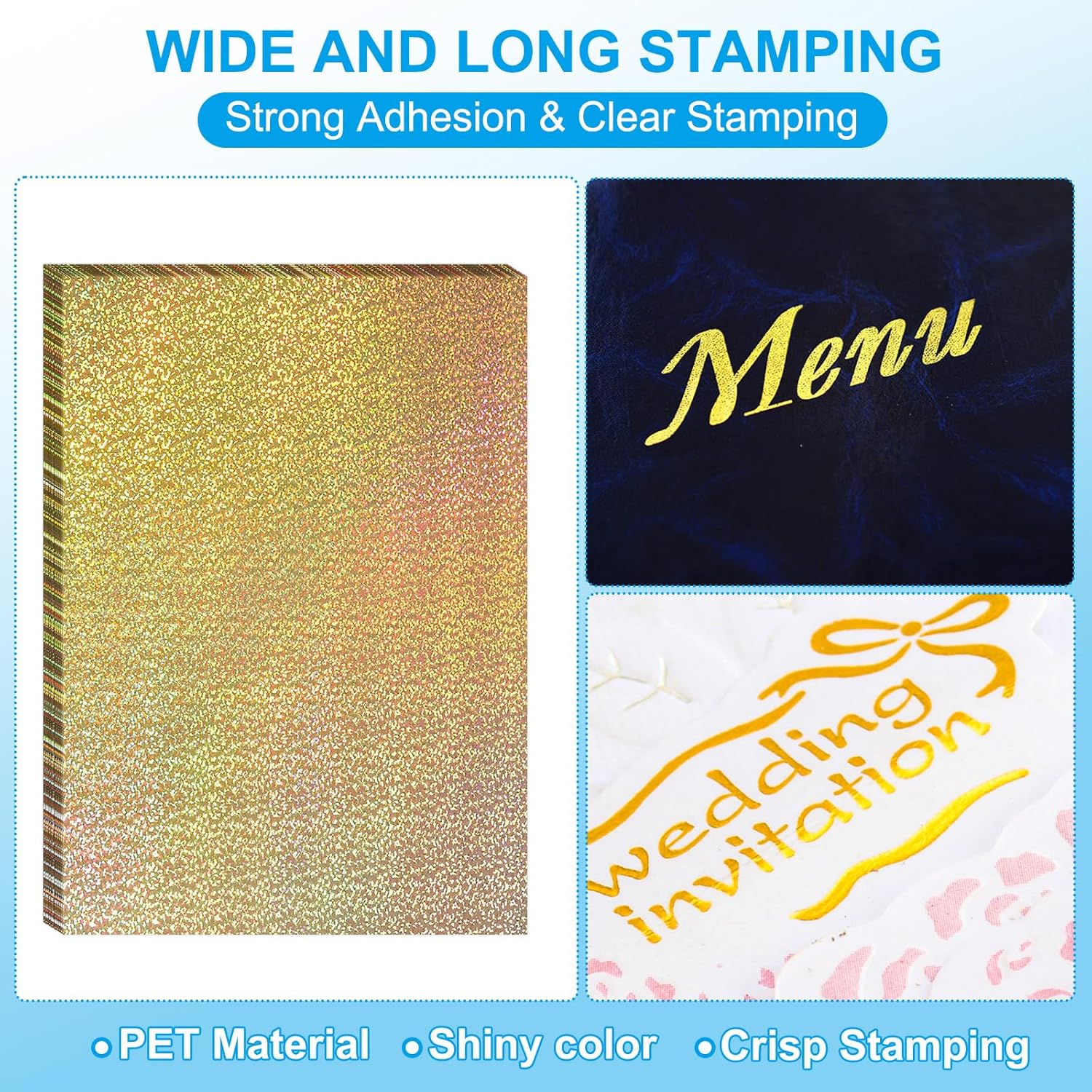 - Advantages: PET plastic material has strong adhesion, clear stamping, bright colors and shiny stamping effect; The stamping foil sheets with a stable and firm texture, which contributes to perfect adhesion and high durability.