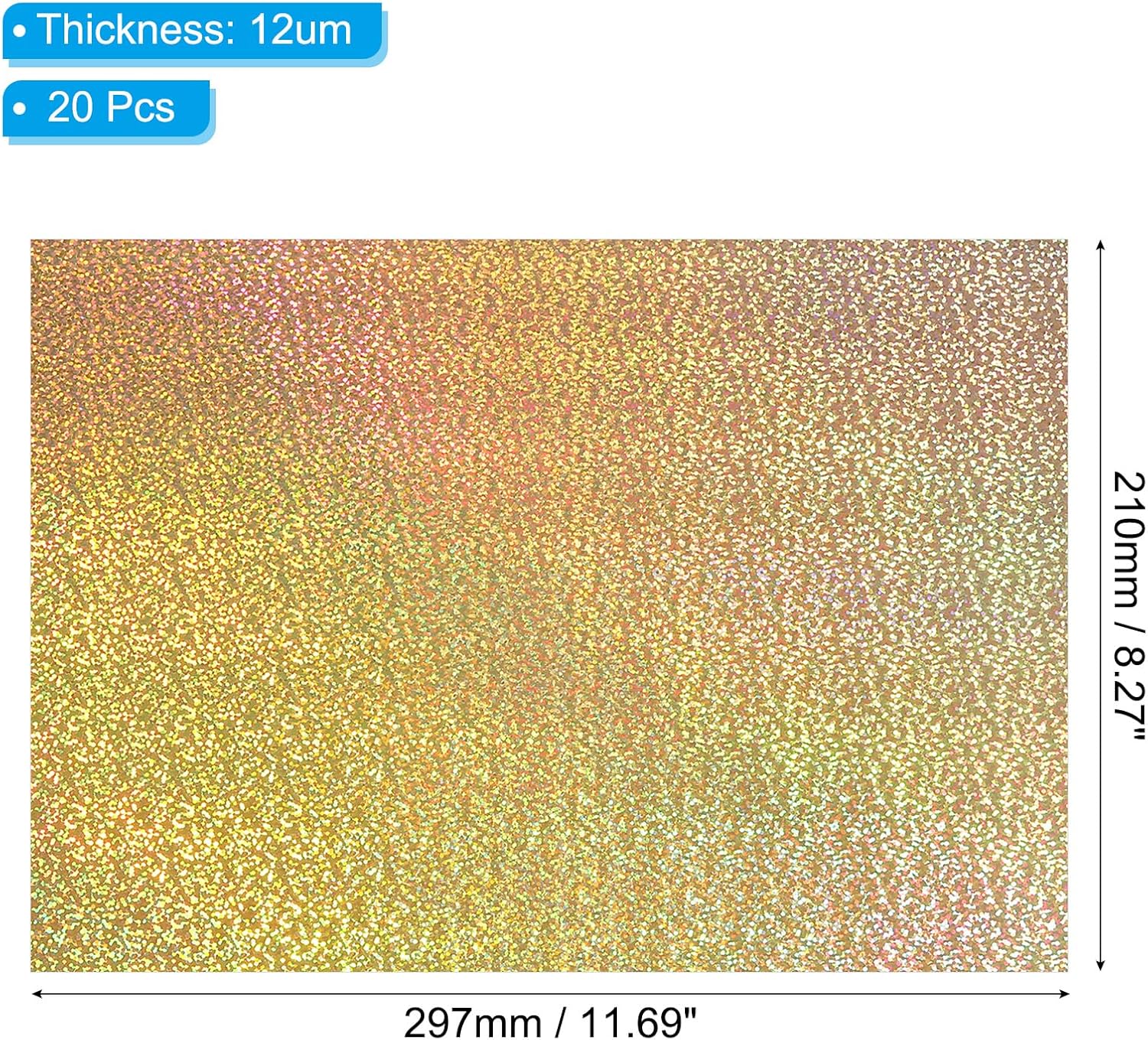 - Specification: Color: Laser Spot Gold; Size: 297 x 210mm / 11.69 x 8.27 inch (L*W); Paper Thickness: 12um; Material: PET Plastic; Packing list: 20 Sheets x Hot stamping foil paper