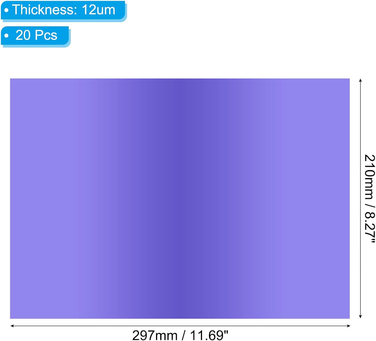 - Specification: Color: Violet; Size: 297 x 210mm / 11.69 x 8.27 inch (L*W); Paper Thickness: 12um; Material: PET Plastic; Packing list: 20 Sheets x Hot stamping foil paper