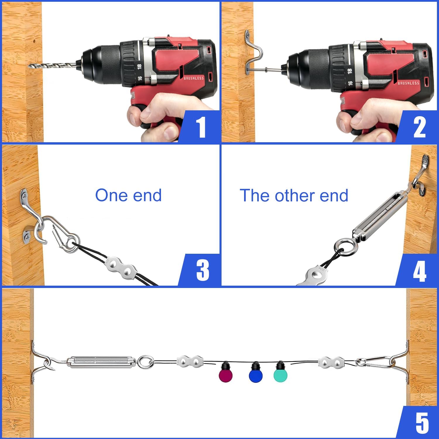 - Easy to Install :Guide Wire for Outdoor String Lights Each Part is Threaded, and Our Wire Rope Kit Includes Simple Tools to Assist in the Installation, to Better Secure All the Accessories, Easy to Assemble or Disassemble, Reusable. The Double Rope Clips Inside Our Steel Cable Kit Hold the Wire Rope more Securely than Single Rope Clips, and The M5 Turnbuckle are Adjustable in Length, Allowing You to Easily Install the String Lights on Wood, Timber or Concrete Walls.