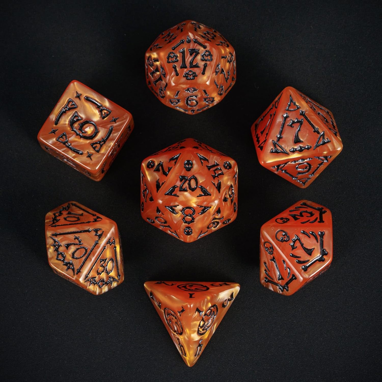 7-Die DND Dice Set Halloween Pattern Polyhedral Die Set with Leather Bag, Skull Dice D&D Die for RPG Table Games (Halloween Pattern-Orange/Black Number)