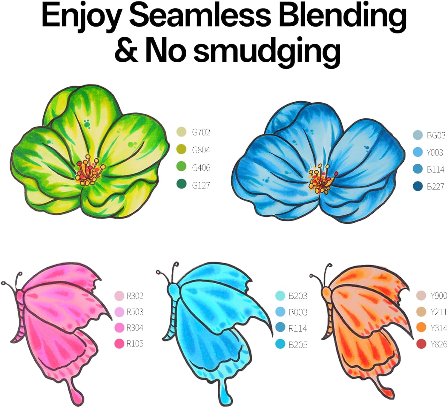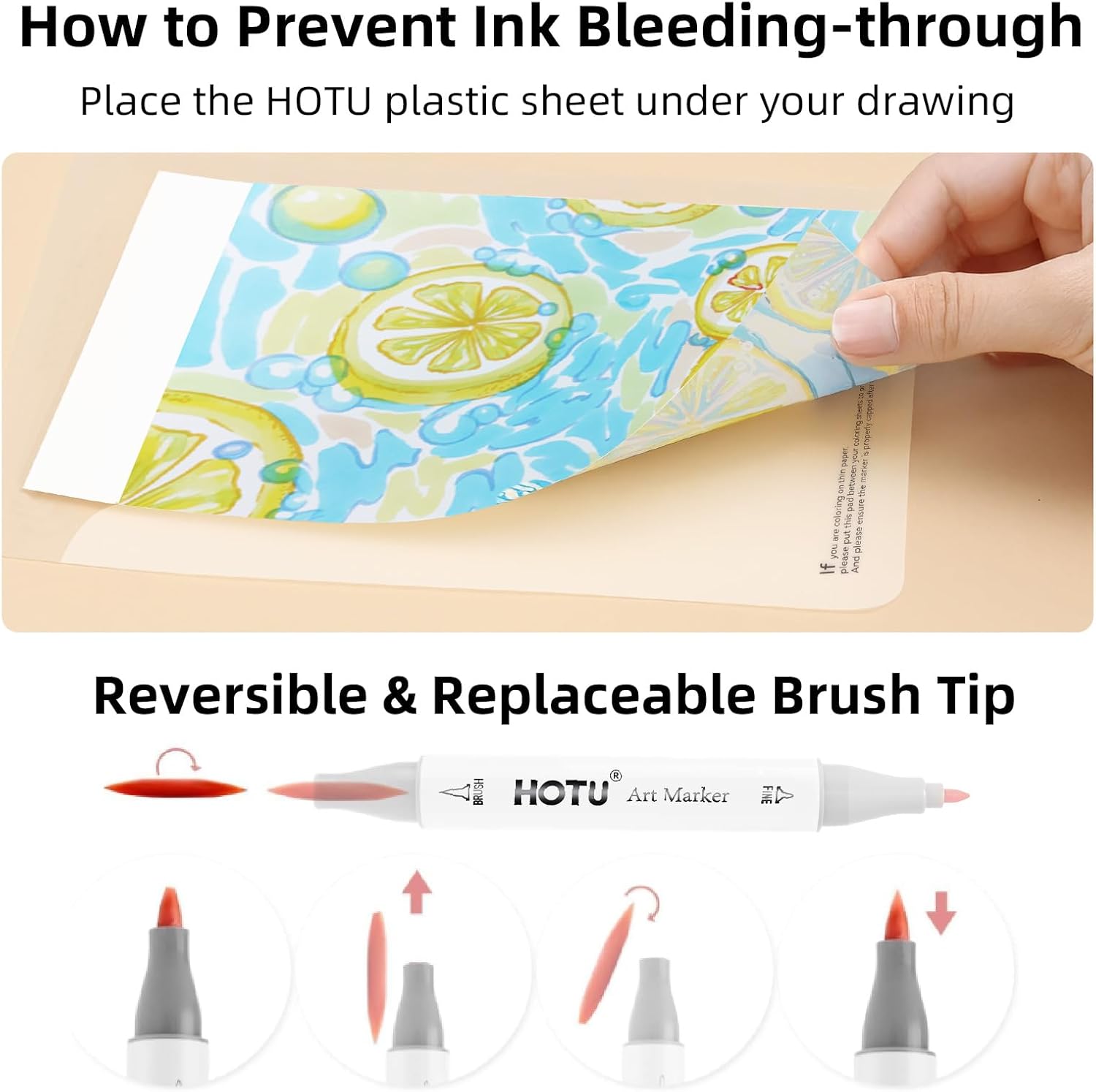 - THOUGHTFUL MULTI-ACCESSORY KIT: HOTU alcohol markers set delivers vibrant colors markers, plus a full kit for smooth, effortless mess-free coloring to easy start. 1 no-bleeding pad: use behind drawing pages to prevent ink from bleeding through; 4 pro artist-designed line art papers: color right after unboxing—enjoy smooth blending and creative relaxation; 1 color swatch: can see all hues at a glance to pick perfect shades fast