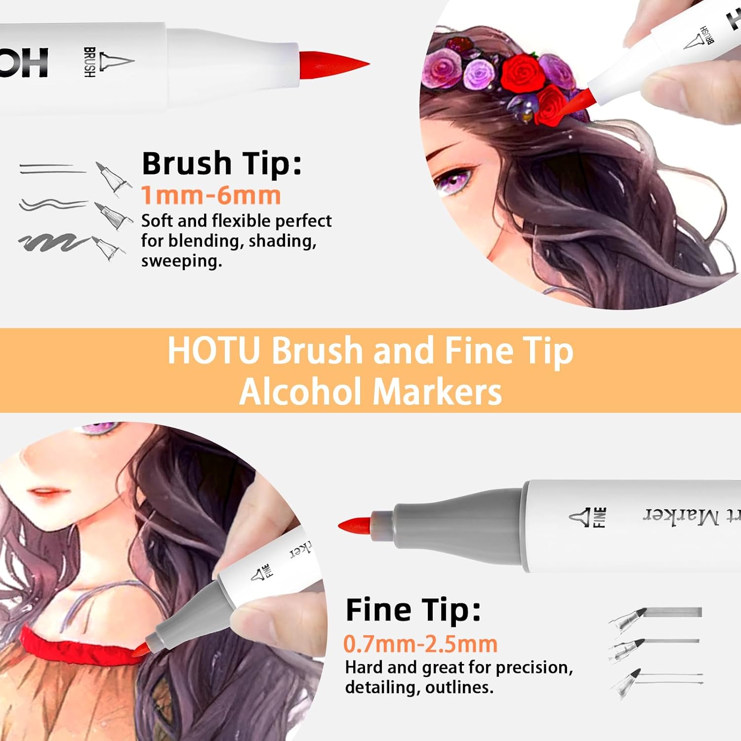- FLEXIBLE BRUSH & FINE DOUBLE-TIP, DOUBLE THE EFFICIENCY: Widen your artistic horizons with the HOTU dual-tip alcohol marker! Our soft brush tip works well for brush calligraphy, sweeping strokes and large areas coloring, while the hard fine tip is perfect for precision drawing like simple outlines and little details. Also, our high quality Japenese nylon brush tip is flexible and reverisble, can applied to various drawing scenes, and no need to worry about durability
