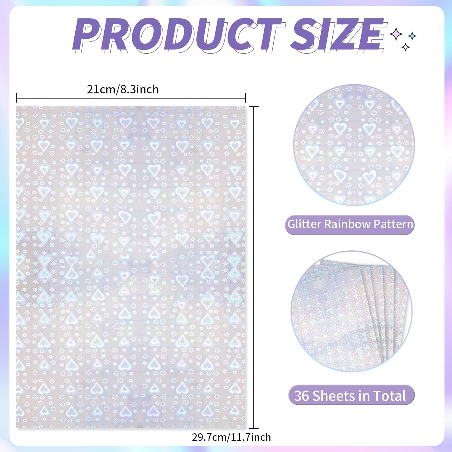 36 Sheets Holographic Sticker Paper,Holographic Laminate Sheets,A4 Size Clear Vinyl Sticker Sheets Self-Adhesive Rainbow Overlay Sheets,11.7 x 8.3 Inches(Heart)