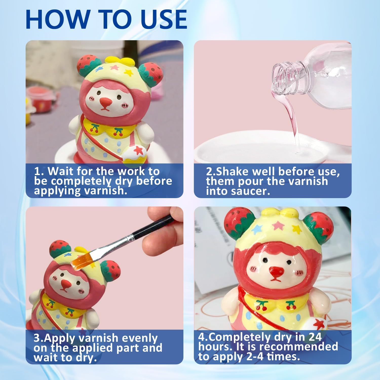 - Durable Protection: Our air dry clay glaze provides the clay work a scratch-resistant and waterproof coating for long-lasting protection. Use clay varnish for a professional-grade glossy effect, making the artwork look more attractive. Gloss varnish forms a crystal clear and solid protective film after drying, effectively preventing the work from yellowing.