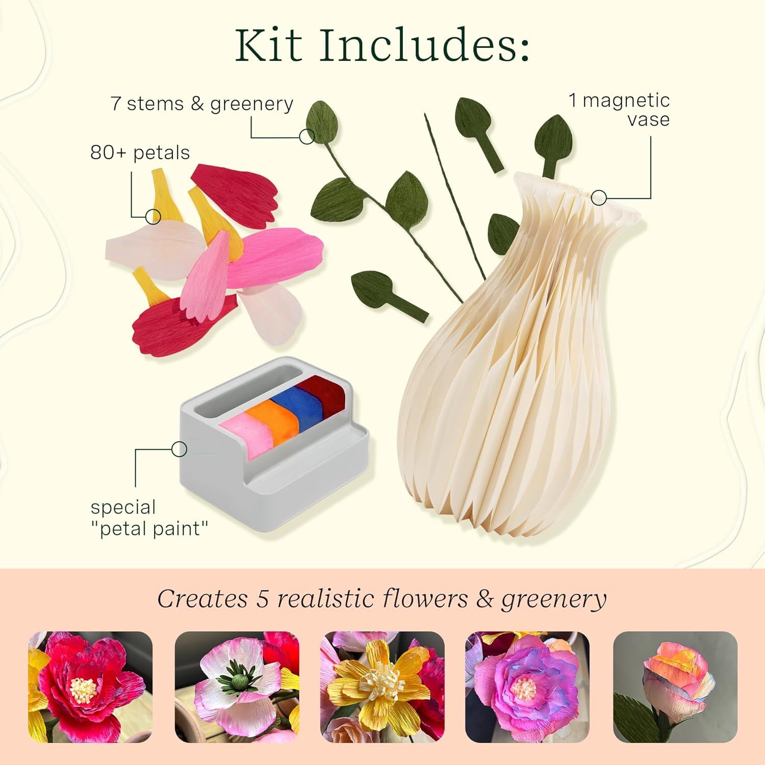 - Kit Includes: Everything you need to create 5 realistic flowers, greenery, and vase customized to your liking! Includes 80+ petals, special "petal paint" to make flowers uniquely your own, 7 stems & greenery, and 1 elegant, magnetic vase.