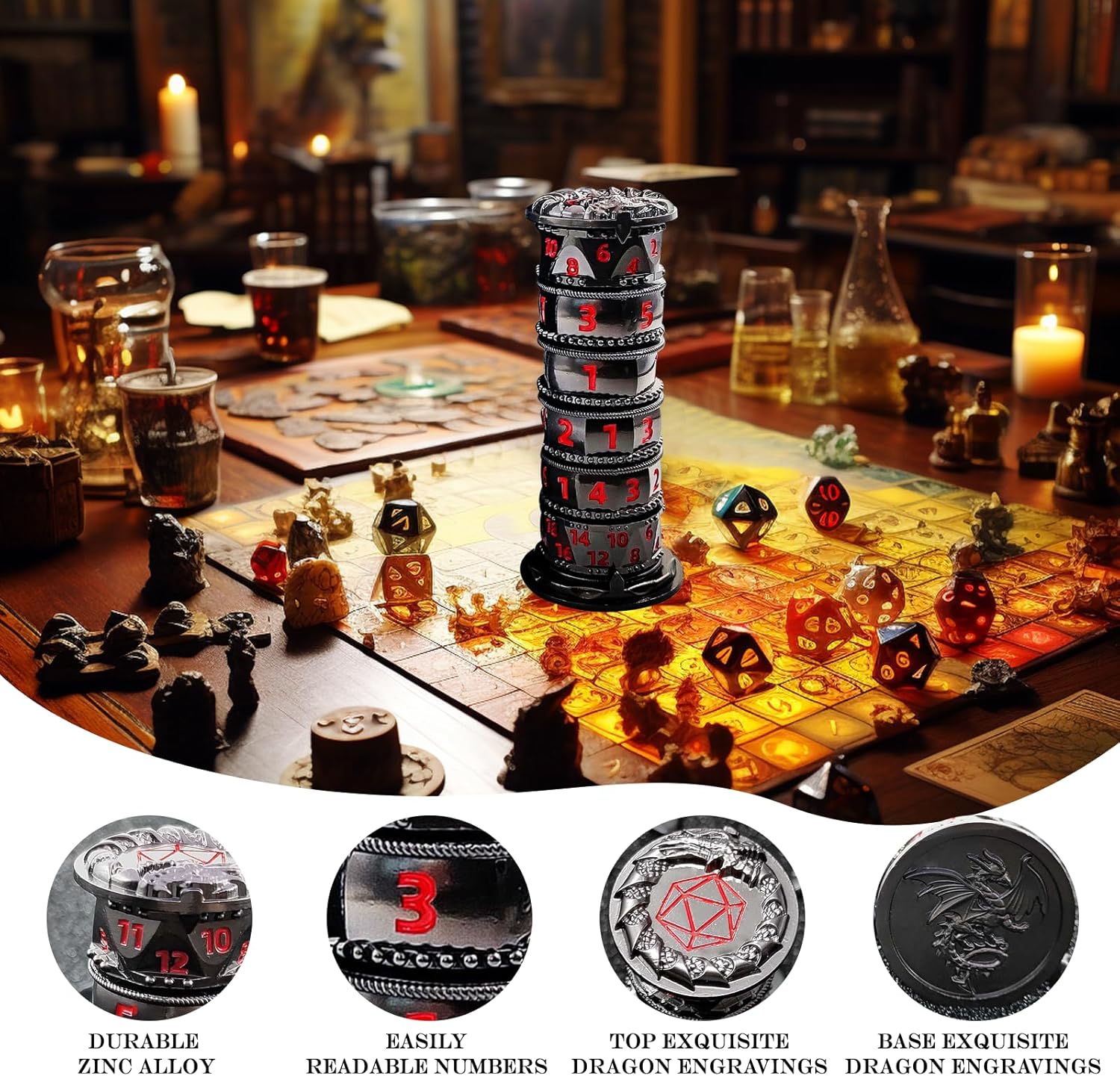 - Exceptional Metal Craftsmanship: Crafted from durable zinc alloy, our unique metal dice tower boasts a heavy feel and robust stability, signifying its premium quality. Each piece is polished and intricately hand-carved with lifelike dragons, symbolizing strength and resilience. The thoughtful design ensures optimal balance and randomness in every roll, enhancing the authenticity of your gaming experience and immersing you deeper into your epic adventures.