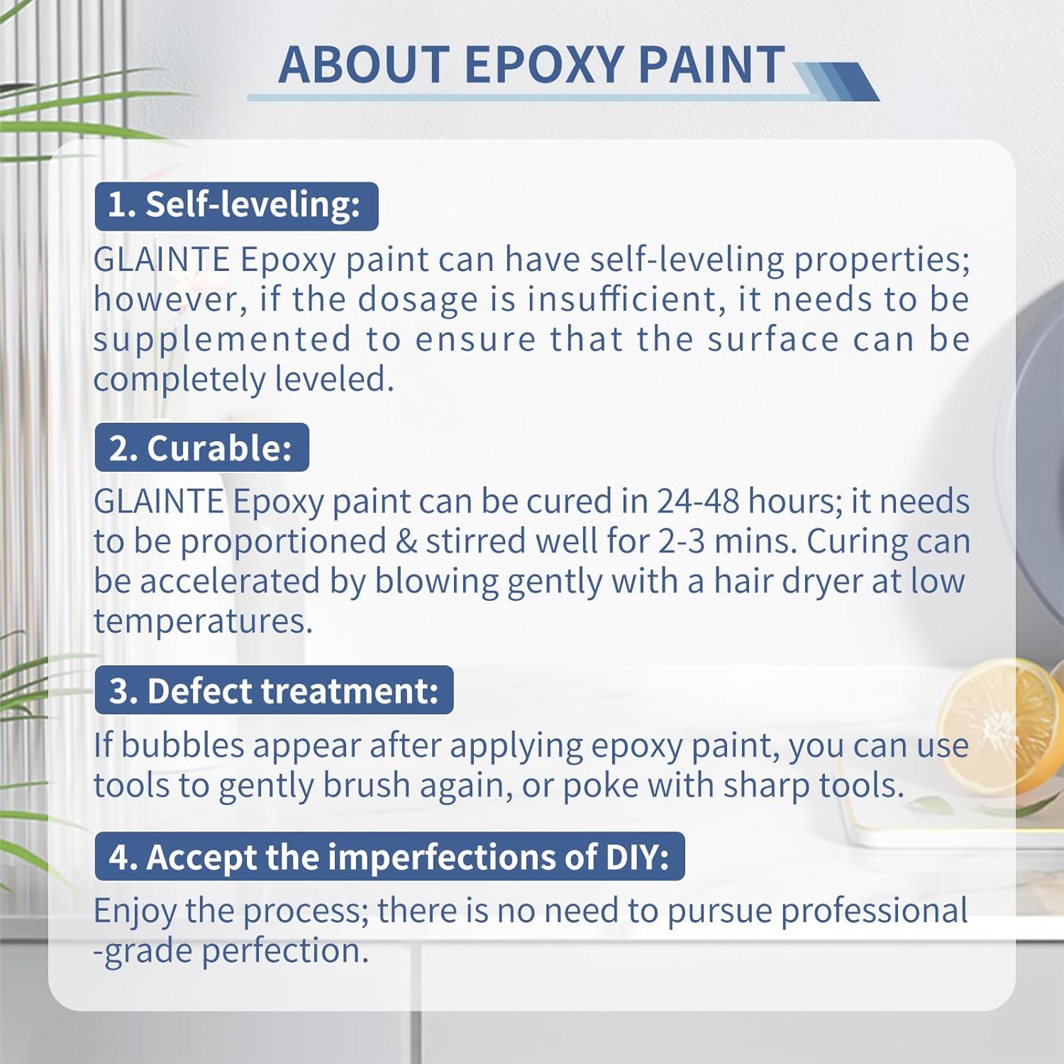 - LONG-LASTING & ANTI-PEELING: GLAINTE epoxy countertop paint kit is able to withstand the wear and tear of daily use, keeping countertops looking as good as new, and is more long-lasting than conventional countertop paints on the market. The thicker epoxy coating ensures that the paint layer is firmly bonded to the surface of the countertop, effectively preventing flaking and peeling and maintaining its stability even in environments with frequent exposure to water and heat