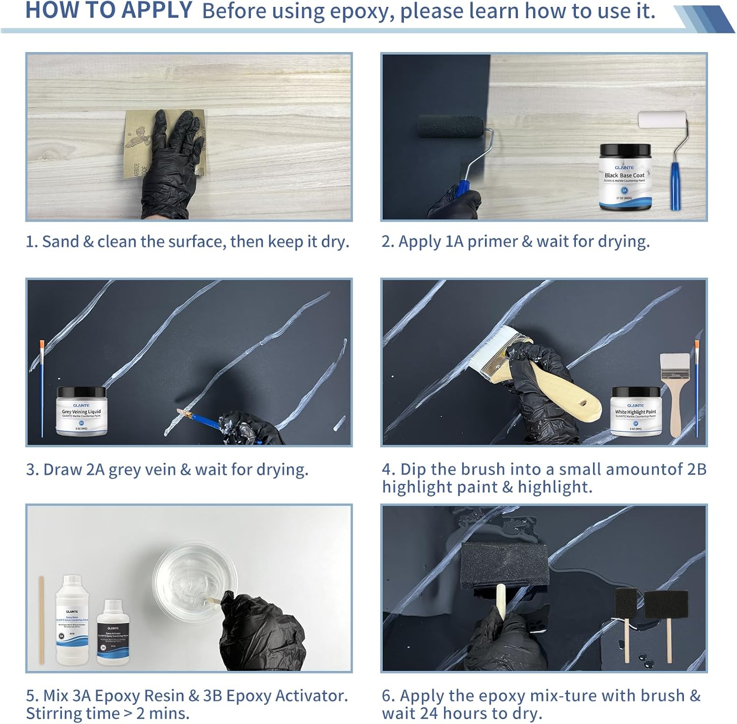 - SAFE & SUSTAINABLE: GLAINTE marble countertop paints are formulated with high-quality water-based paint that is low-odor, non-toxic, and water-based. Suitable for flat and smooth surfaces such as wood, tiles, etc. Achieve the luxurious look of marble in just one weekend. NOTE: If bubbles appear when applying epoxy, use a black sponge brush to reapply, or use a sharp tool to pierce them. DIY production can not be perfect; please understand