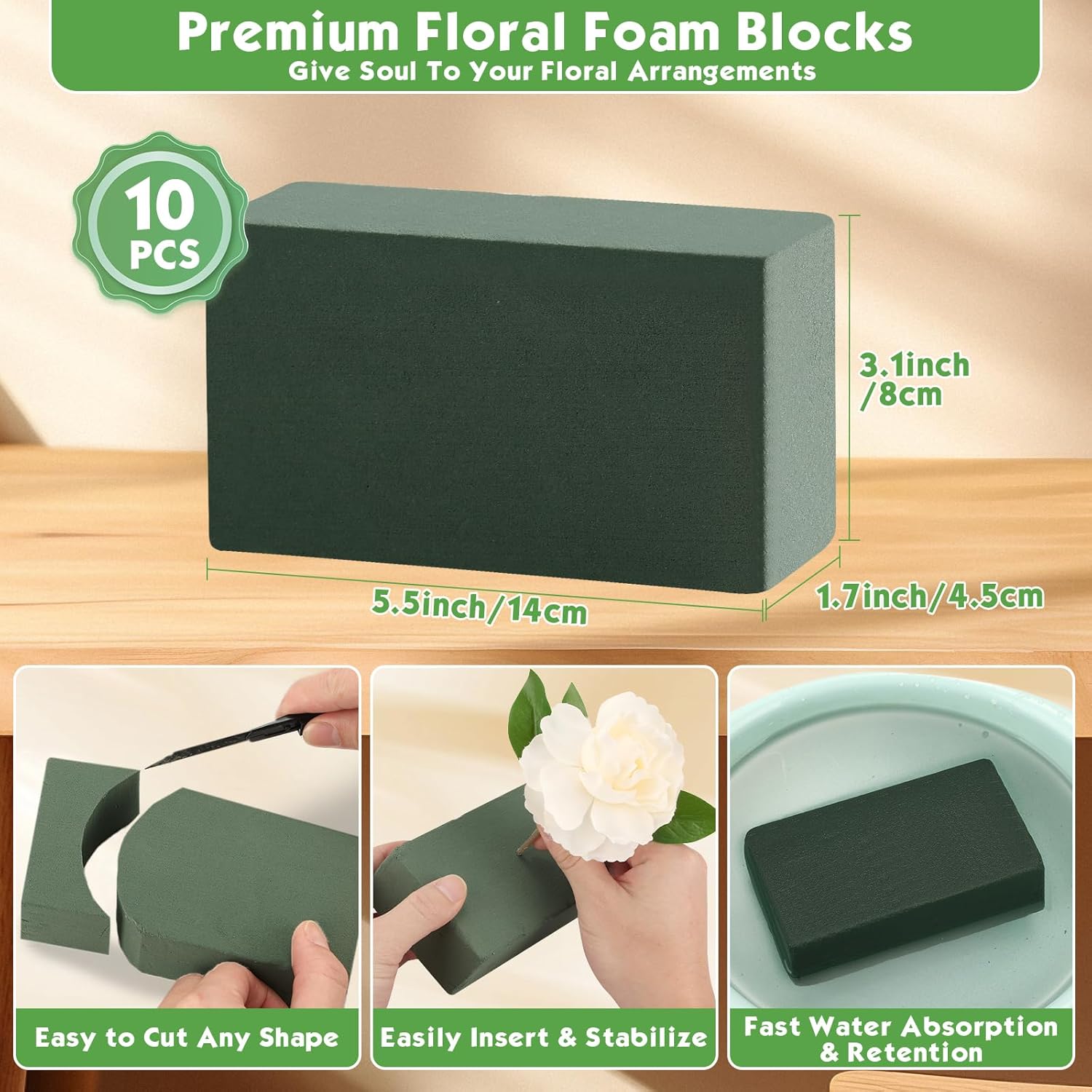 - 【10 Pcs Premium Floral Foam Bricks for All Your Flower Arrangements】Our floral foam bricks are designed to hold fresh or artificial flowers securely in place, making them perfect for DIY projects, weddings, home decor, and professional floral designs. Each brick measures 5.5”L x 3.1”W x 1.7”H, providing ample space for creative arrangements.