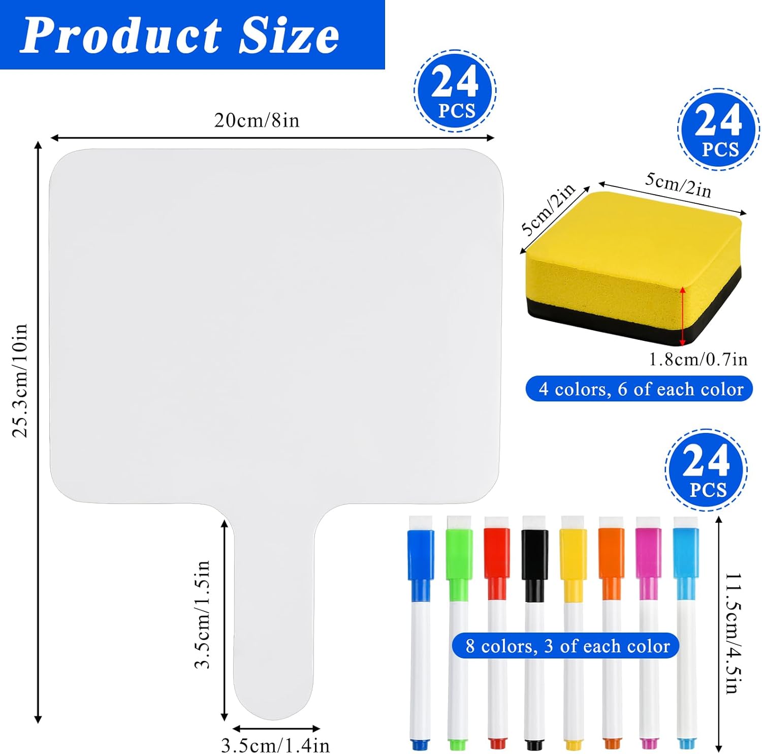 - Set Includes - 24 dry erase paddles, 24 pcs 8-color markers (3 pcs per color) and 24 pcs 4-color board erasers (6 pcs per color). This set is well-designed and fully equipped to meet your diversified needs on different occasions, allowing you to record and display easily anytime, anywhere