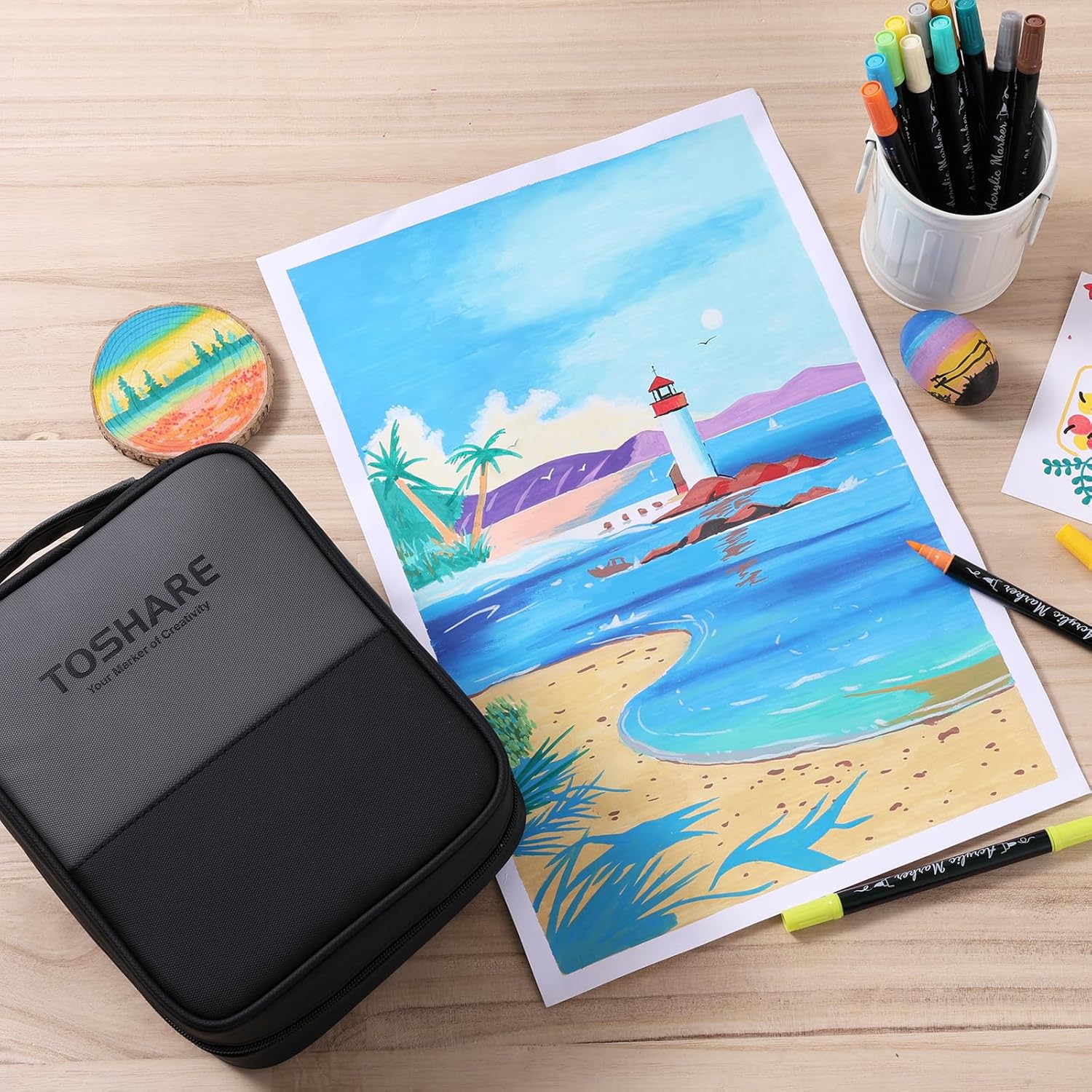 - Widely Used Art Supplies: Our dual-tip coloring markers work on almost any surface, not only paper but also beautifully on rocks, wood, mugs, canvas, fabric, leather, ceramics, tiles, glass, resin, tires, balckboard, window, car, christmas ornament, jar labels, add decoration to graffiti, card making, bullet journal, pumpkin designs, easter eggs, and other smooth or porous surfaces. The wide uses brings more creative possibilities to your art projects.