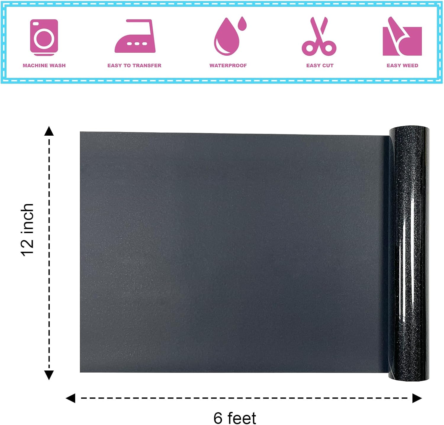 Black Glitter HTV Heat Transfer Vinyl 12" x6FT Glitter Vinyl for T Shirts Easy to Cut and Weed Compatible with All Cutter Machines HTV Vinyl Iron on for Cricut (Black, 12Inches*6Ft)