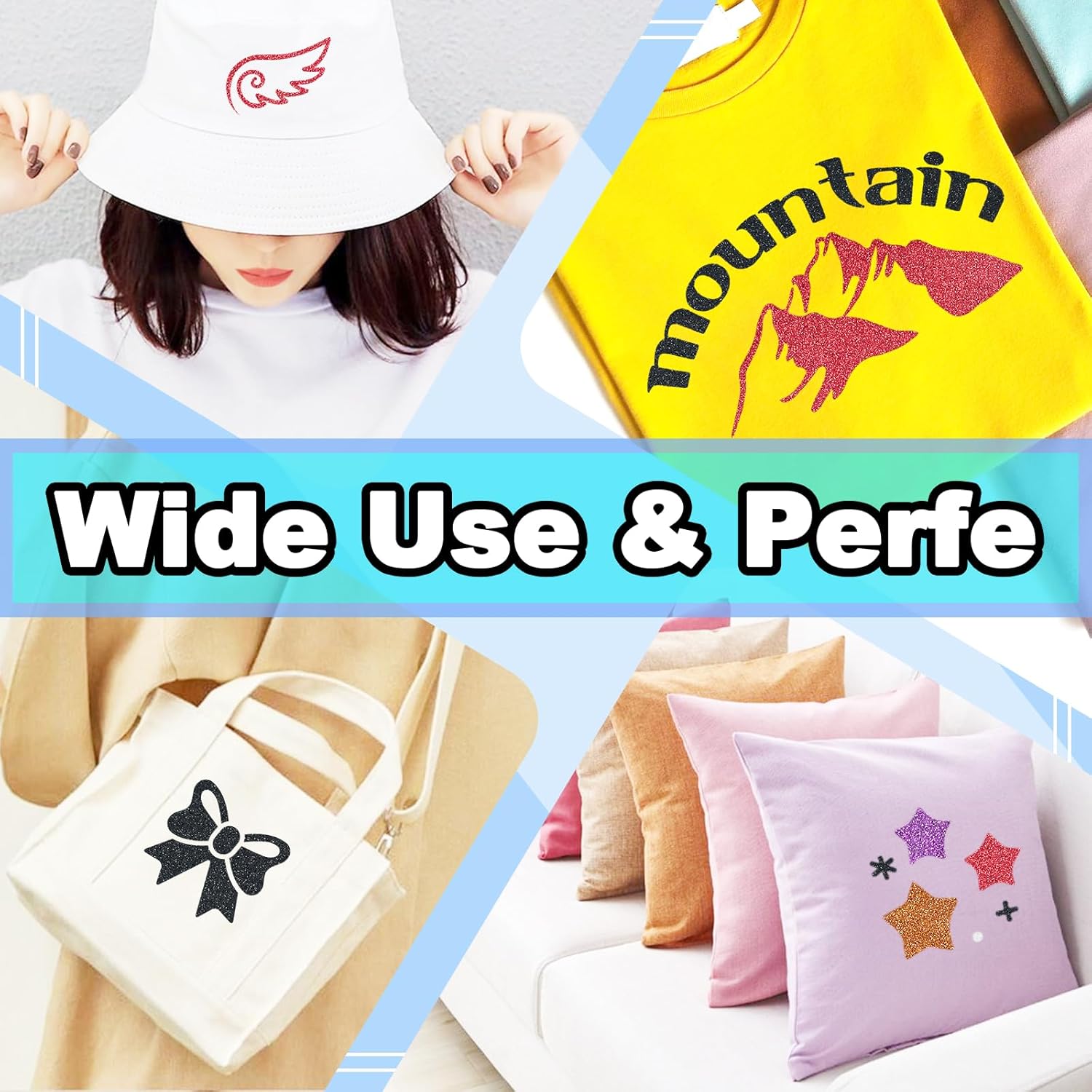 - Versatile Material Compatibility: Perfect for customizing a variety of fabrics like cotton, polyester, and blends, our glitter heat transfer vinyl is excellent for creating custom designs on hats, aprons, and pillows