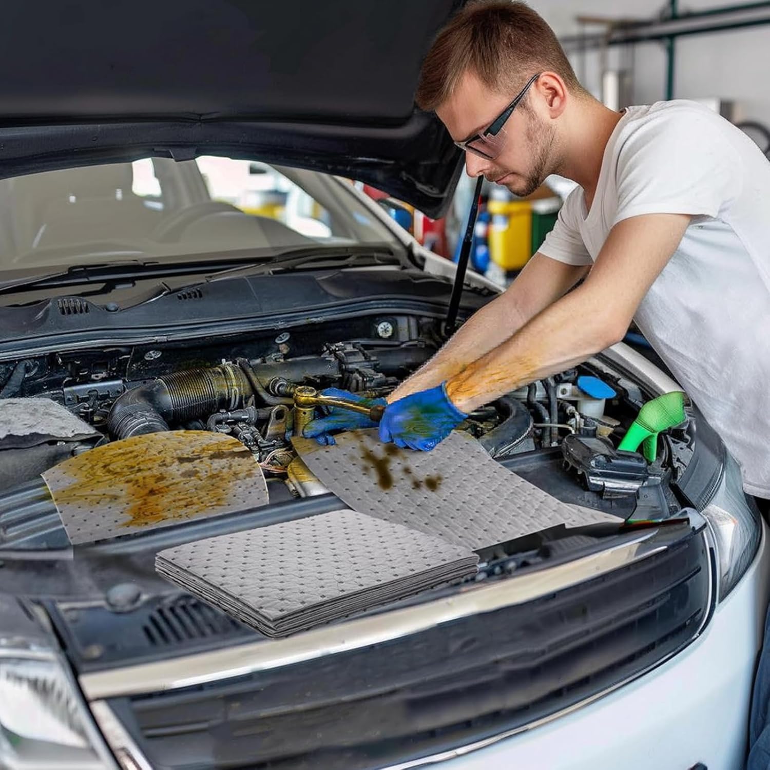 100 Pcs Oil Absorbent Pads - 10"x13" Oil Spill Mats for Garage, Workshop & Auto Repair, Reusable, Fast Cleanup for Oil, Grease & Coolant (Grey, Boxed)