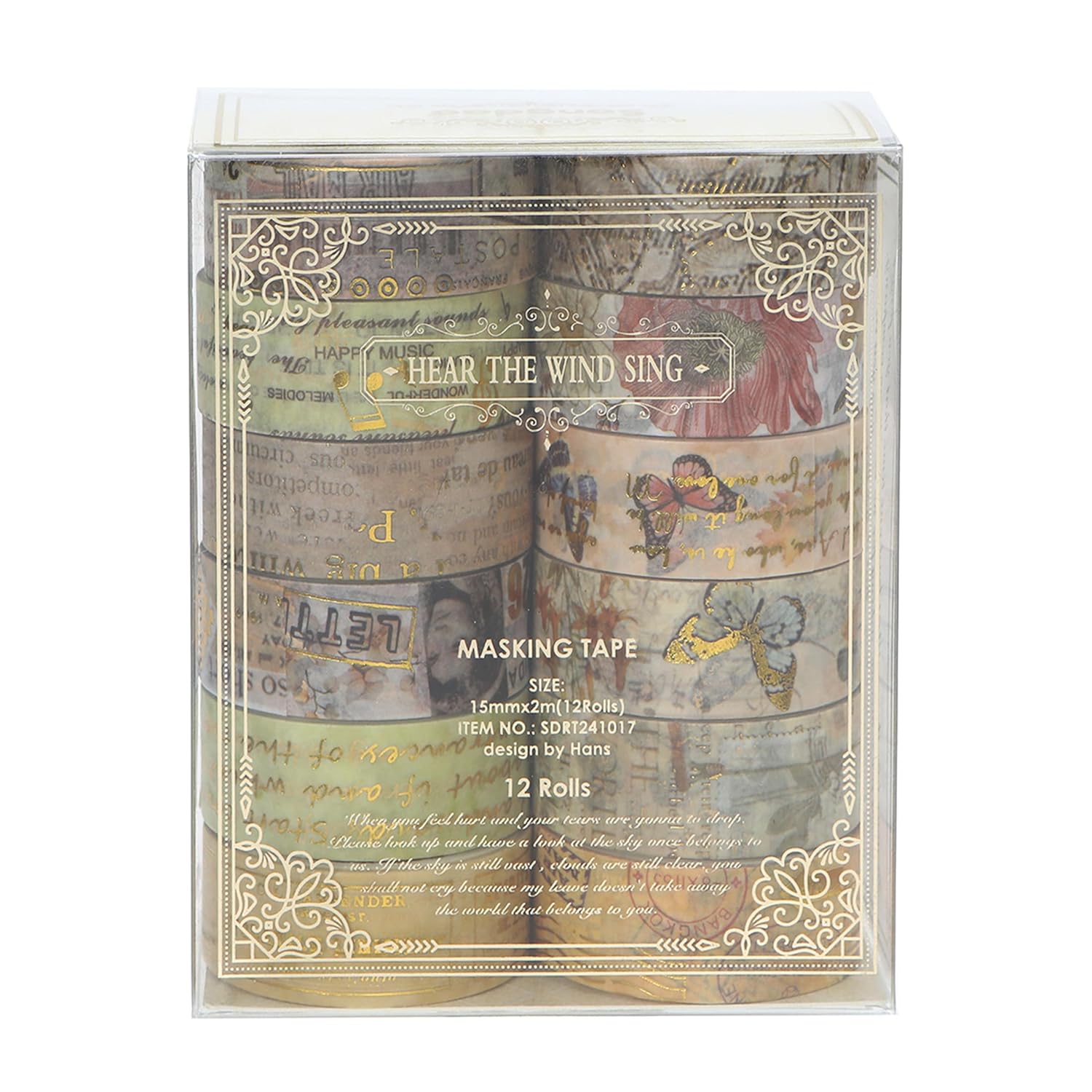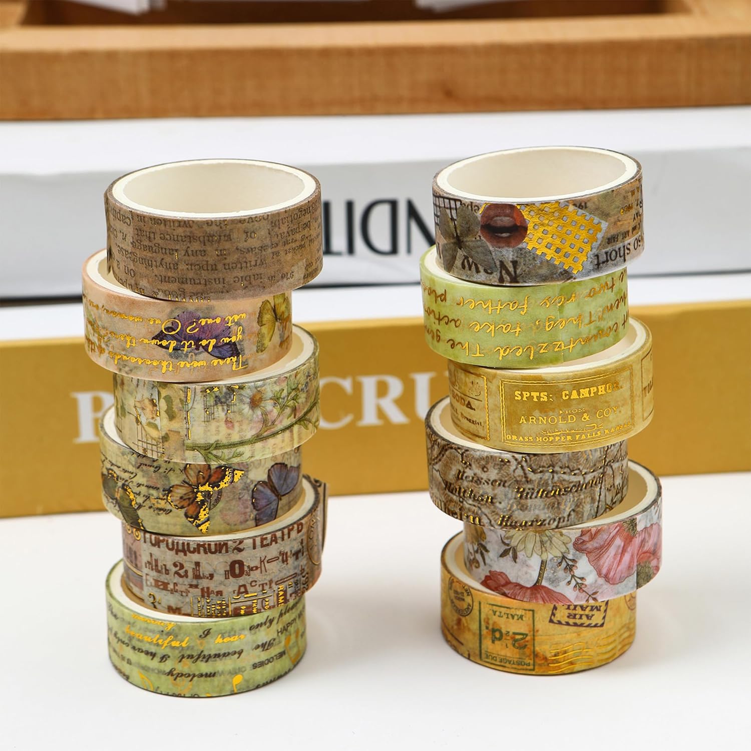 12 Rolls Charming Washi Tape Set Gold Silver Foil Detailing Arts Adhesive Tapes Basic Patterns Decorative Masking Tape Sets for Craft, Kids, Scrapbook, DIY, Gift Wrapping (Vintage Elegance)