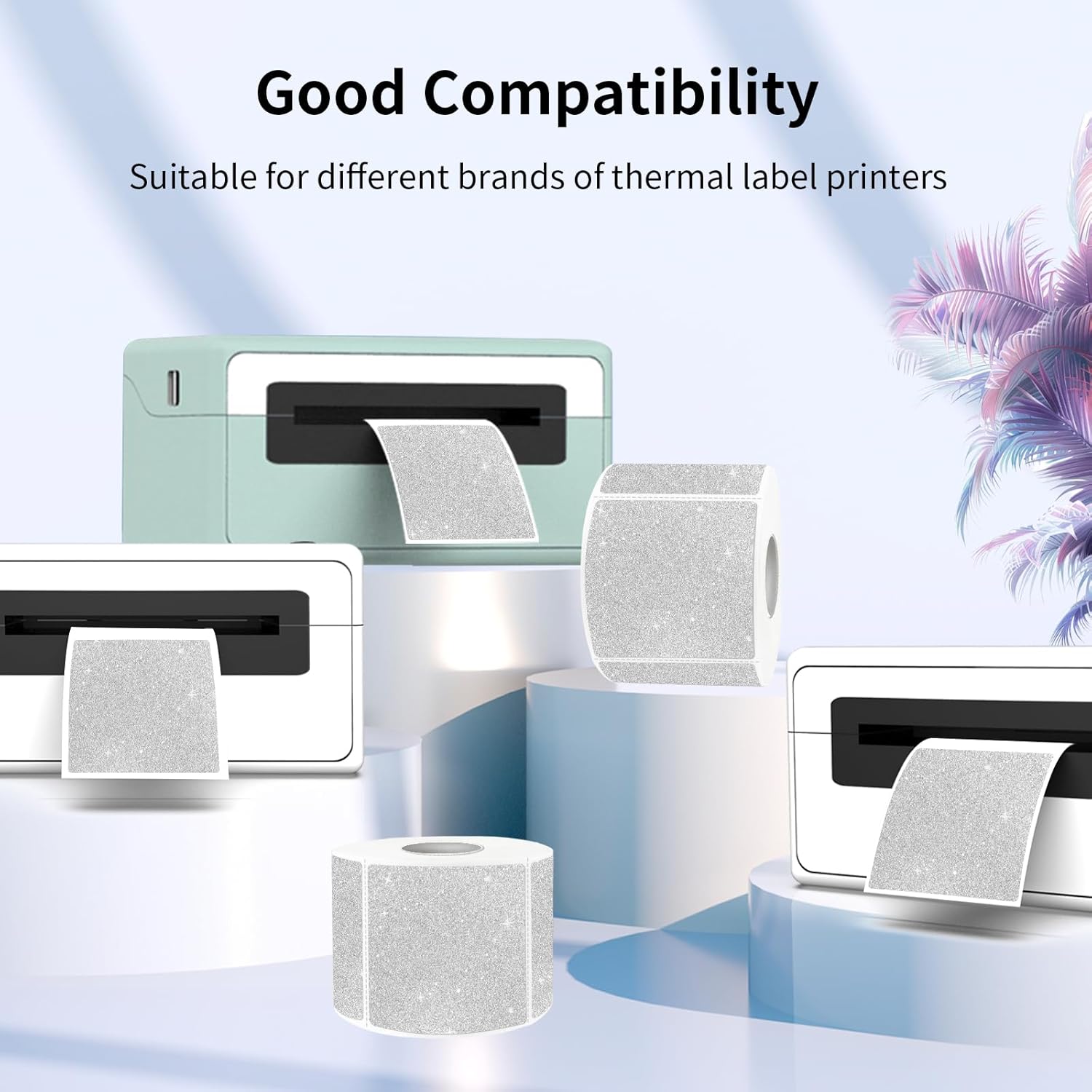 2" x 2" Square Thermal Labels Stickers, Holographic Glitter Thermal Stickers Labels, Waterproof Direct Thermals Label for Small Business, DIY Design- Silver