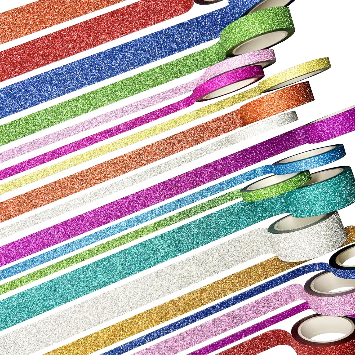 - Package Includes- 36 Rolls glitter masking tape set comes in 3 size width and 12 vibrant colors with 0.59inch (15mm) wide x 12 tapes; 0.39inch (10mm) wide x 12 tapes; 0.19inch (5mm) wide x 12 tapes. Each roll is 5 meters (16.4 feet) long and enough quantity and length for you to decorate your handmade projects