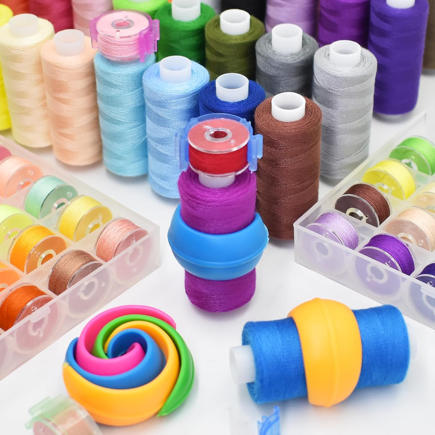 - Super Value Sewing Thread Kit: 50pcs different colors sewing thread and 50pcs different colors prewound bobbins, with cases. We have also added sewing accessories to better complete your sewing projects: 10 needles + 2 threaders + 8 spool holder, 10 clear bobbin clips