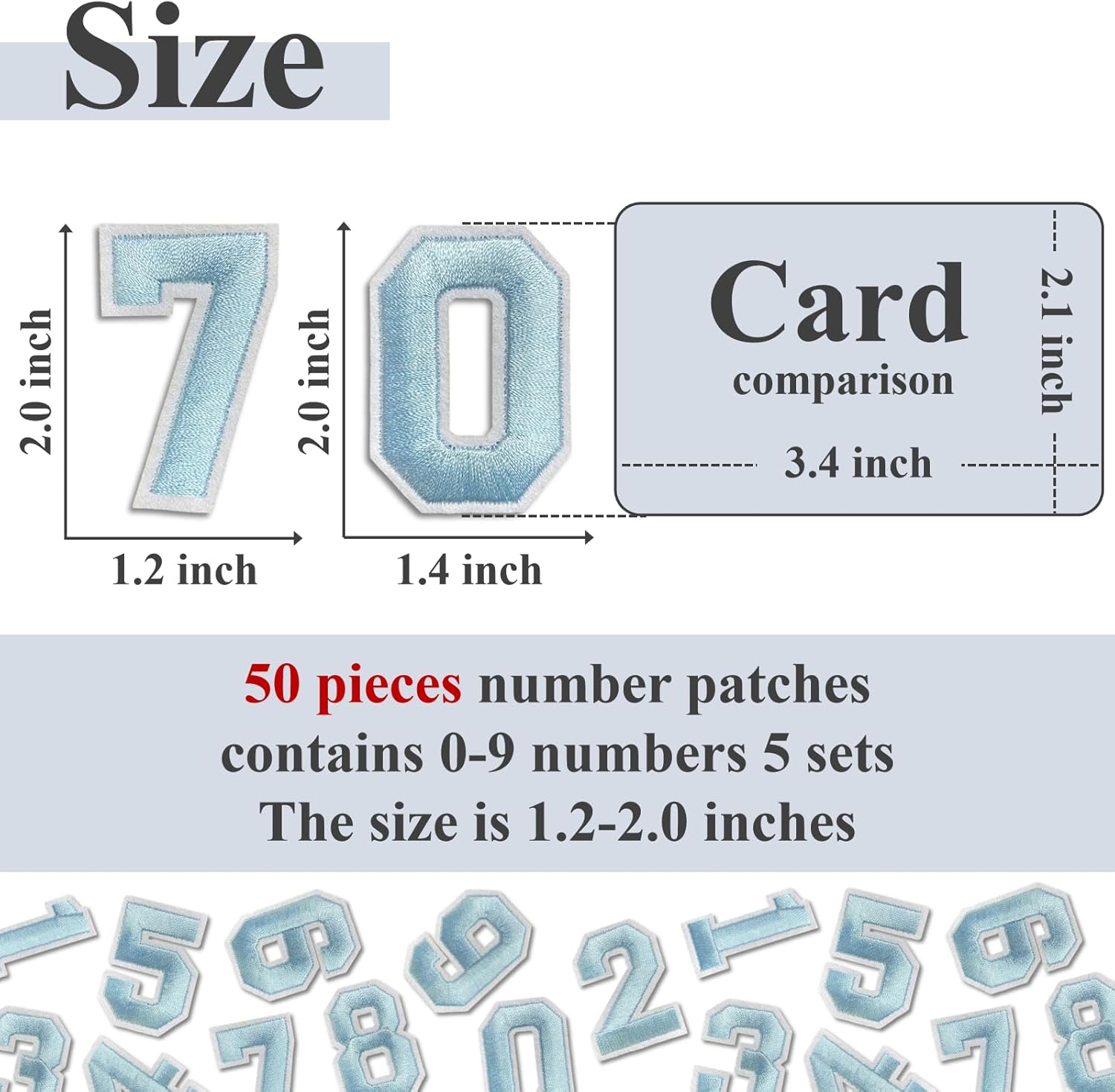 Number Iron On Patches, Numbers 0-9 Embroidery Applique Patch, DIY Decorative Heat Press Patches for Clothing Jeans Jackets Backpacks Hats (Light Blue 50 Pcs)