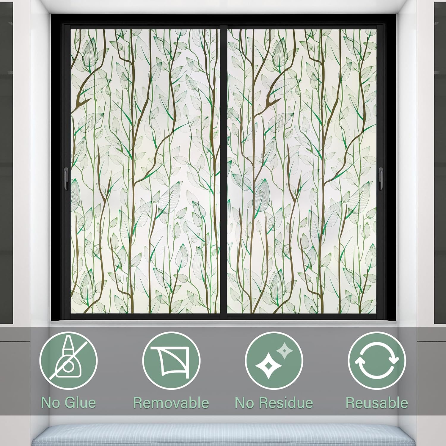 Donox Frosted Glass Window Film Heat Control UV Blocking, Static Cling Reusable Home Bathroom Door Window Privacy Film, Green Leaf Pattern Window Covering with Installation Tool, 17.5 in x 6.5 feet