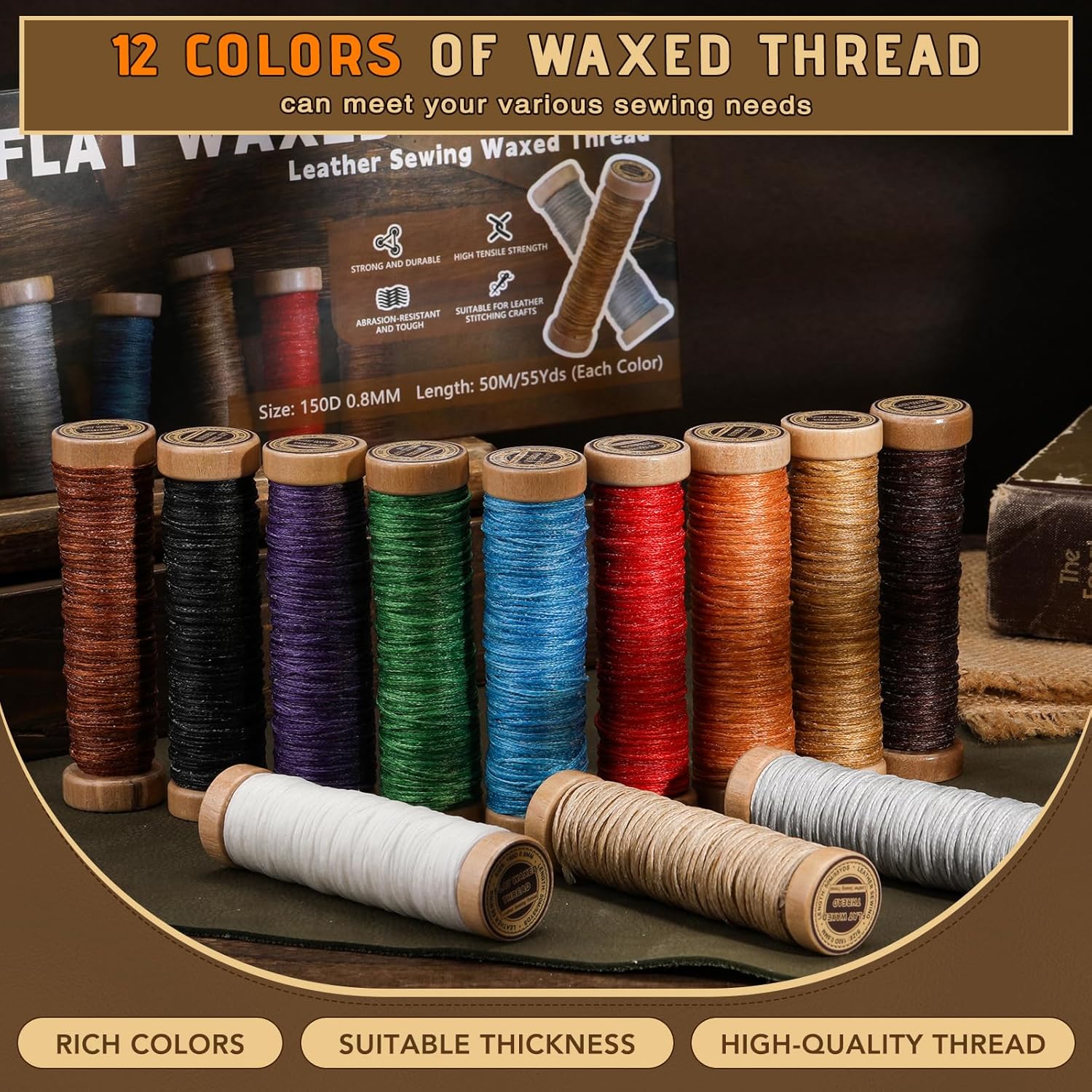 - 12 Different Colors: Our waxed thread includes various colors, including white, khaki, grass green, lake blue, red, purple, light coffee, coffee, medium coffee, dark coffee, light gray, and black. Dark and light color matching can meet different sewing needs