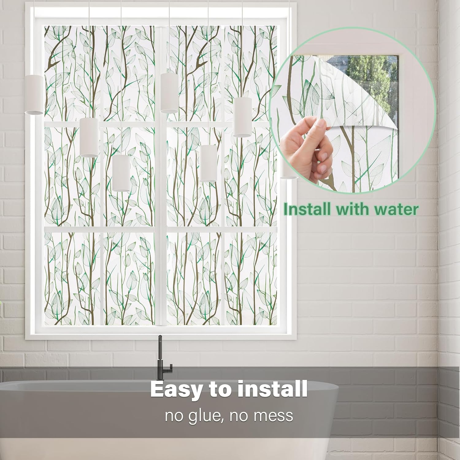 Donox Frosted Glass Window Film Heat Control UV Blocking, Static Cling Reusable Home Bathroom Door Window Privacy Film, Green Leaf Pattern Window Covering with Installation Tool, 35.4 in x 6.5 feet