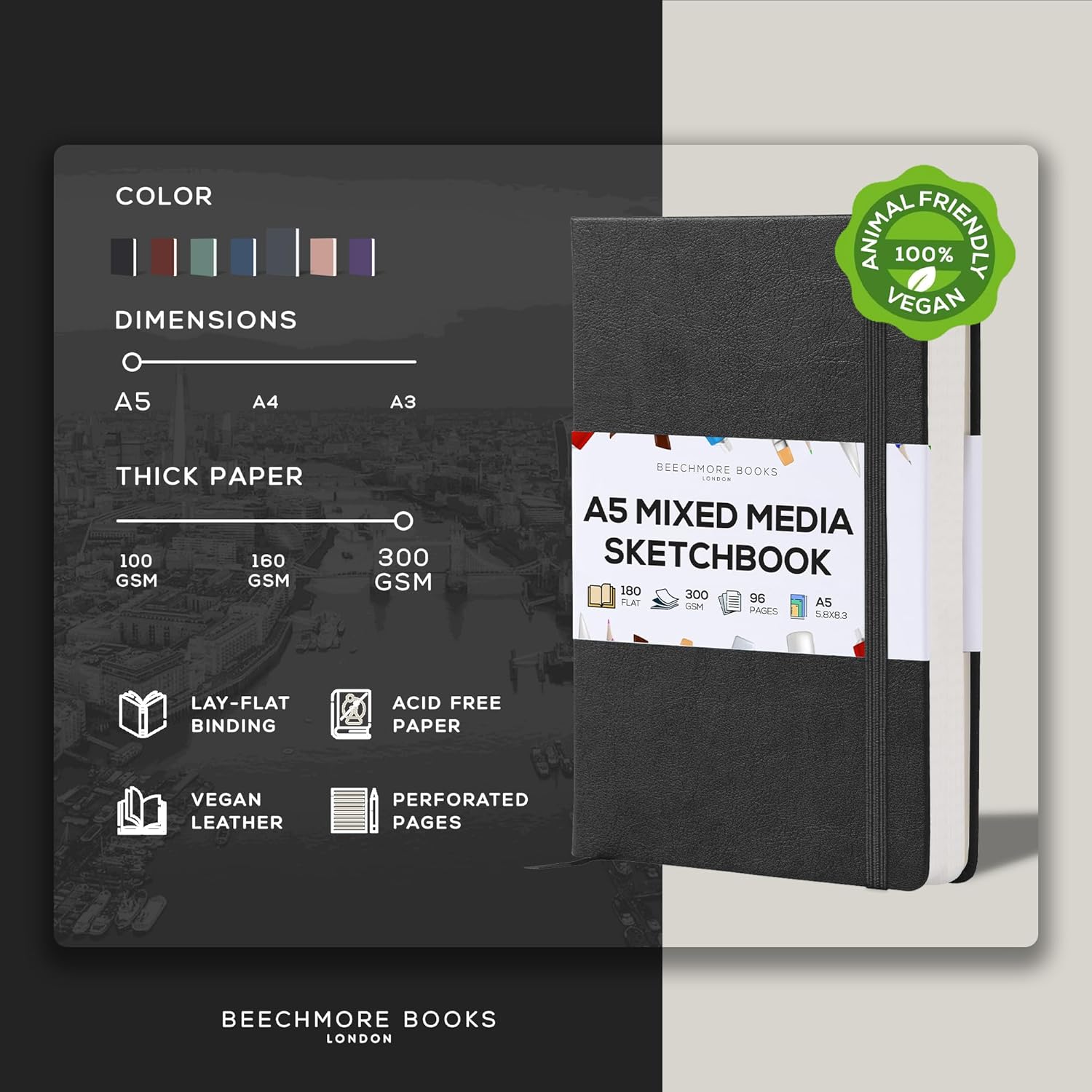 Beechmore Books A5 Sketch Book – 5.8"x8.3" Premium Vegan Leather Hardcover Sketchbook, 96 Thick 300gsm Perforated Ivory Pages, Ideal for Sketching, Watercolor & Mixed Media, Includes Back Pocket