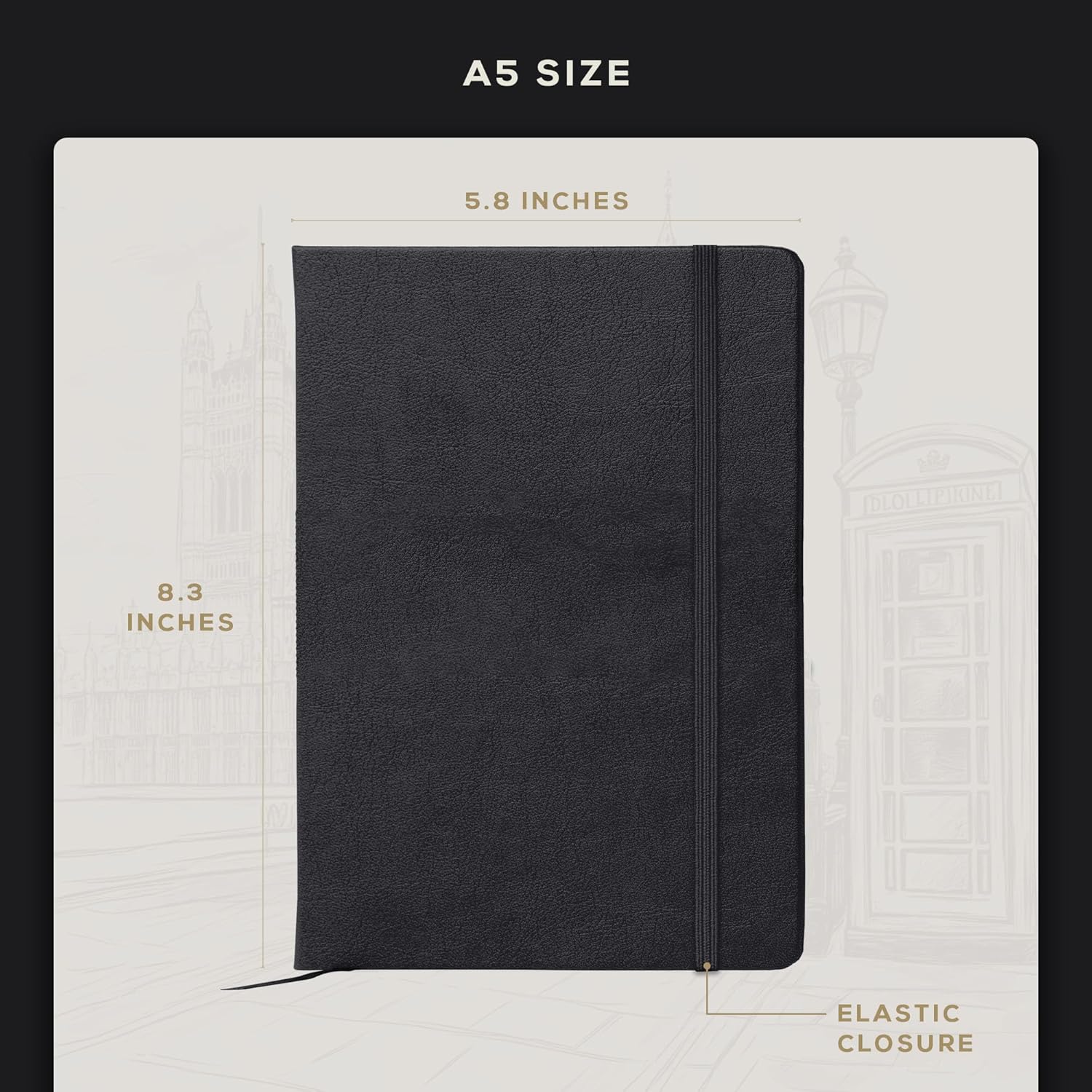 - Premium Vegan-Leather Hardcover & Lay-Flat Thread Binding – Opens 180° for seamless spreads; elastic closure, ribbon bookmark & gusseted back pocket keep tools and loose sheets secure.