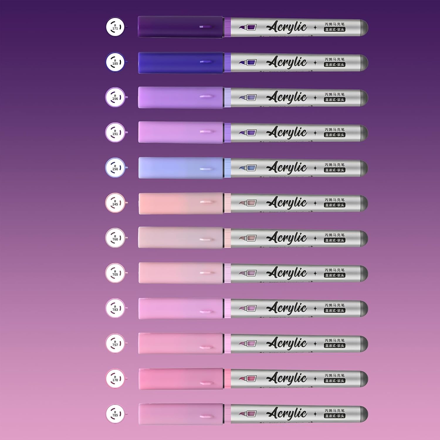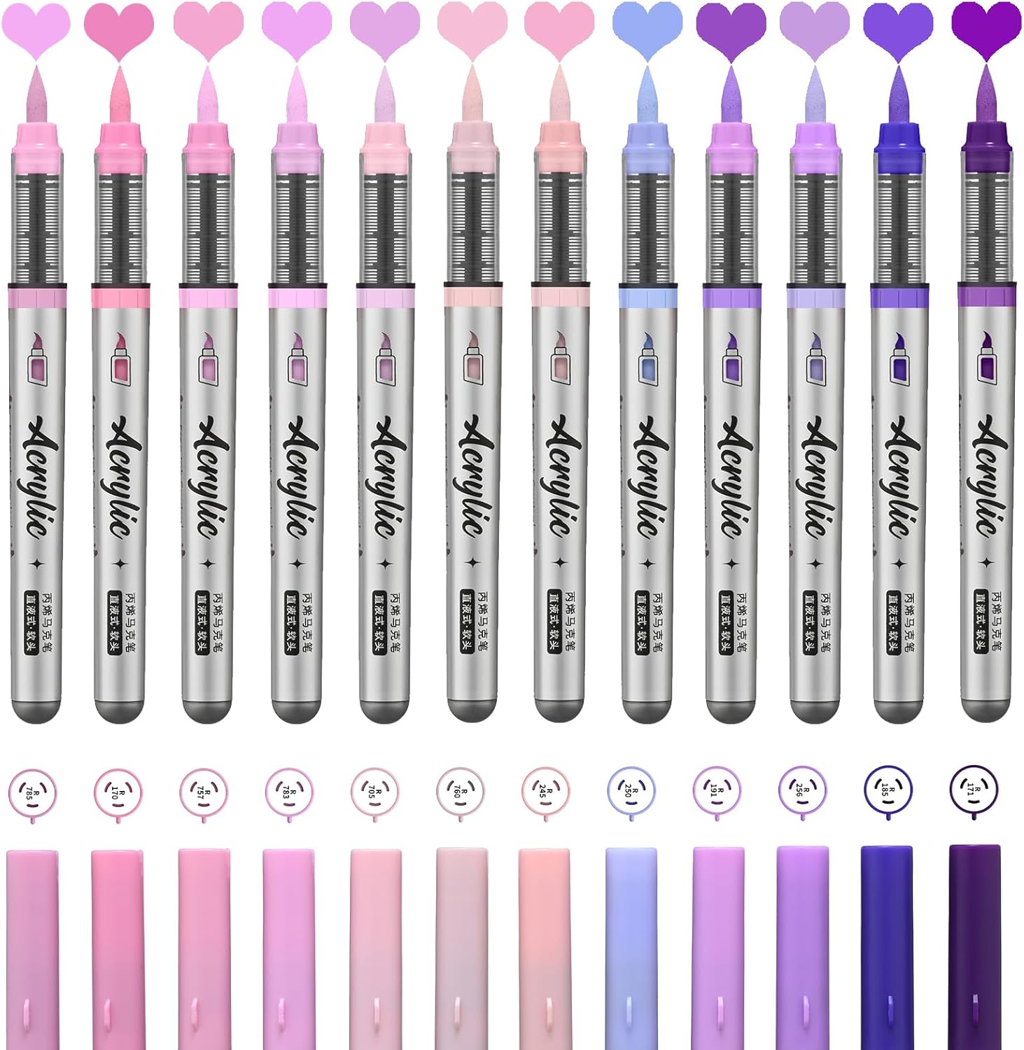 Purple Pink Acrylic Paint Pens,12 Color Paint Pens Markers,Brush Tip Paint Pens for Rock Painting Wood Glass Ceramic Canvas Stone DIY Crafts Making Art Supplies