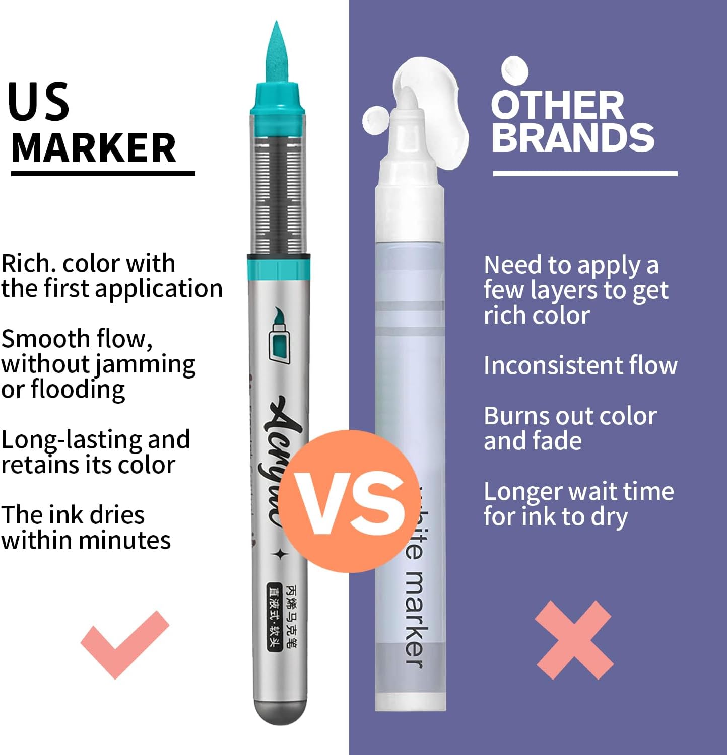 - Brush Tip Acrylic Pens: You can determine the thickness of the lines according to your needs,1-5mm broad brush tips for broader strokes and larger coverage areas,allowing artists to effortlessly create strokes of various thicknesses for precise expressio
