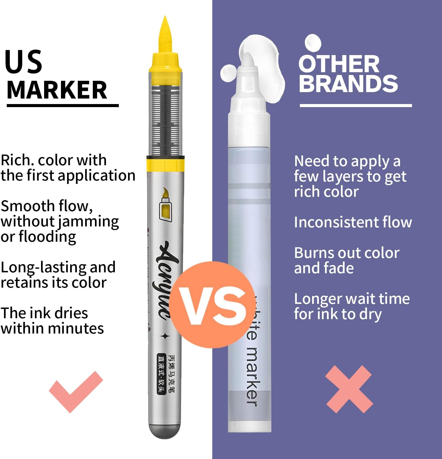 - Brush Tip Acrylic Pens: You can determine the thickness of the lines according to your needs,1-5mm broad brush tips for broader strokes and larger coverage areas,allowing artists to effortlessly create strokes of various thicknesses for precise expressio