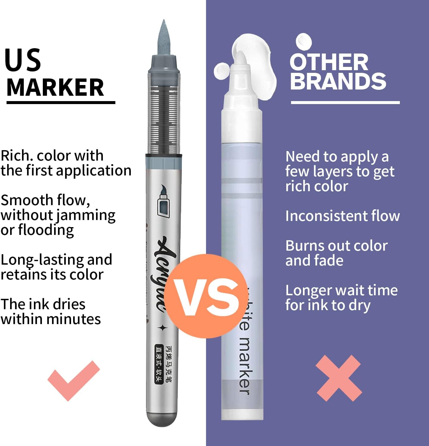 - Brush Tip Acrylic Pens: You can determine the thickness of the lines according to your needs,1-5mm broad brush tips for broader strokes and larger coverage areas,allowing artists to effortlessly create strokes of various thicknesses for precise expressio