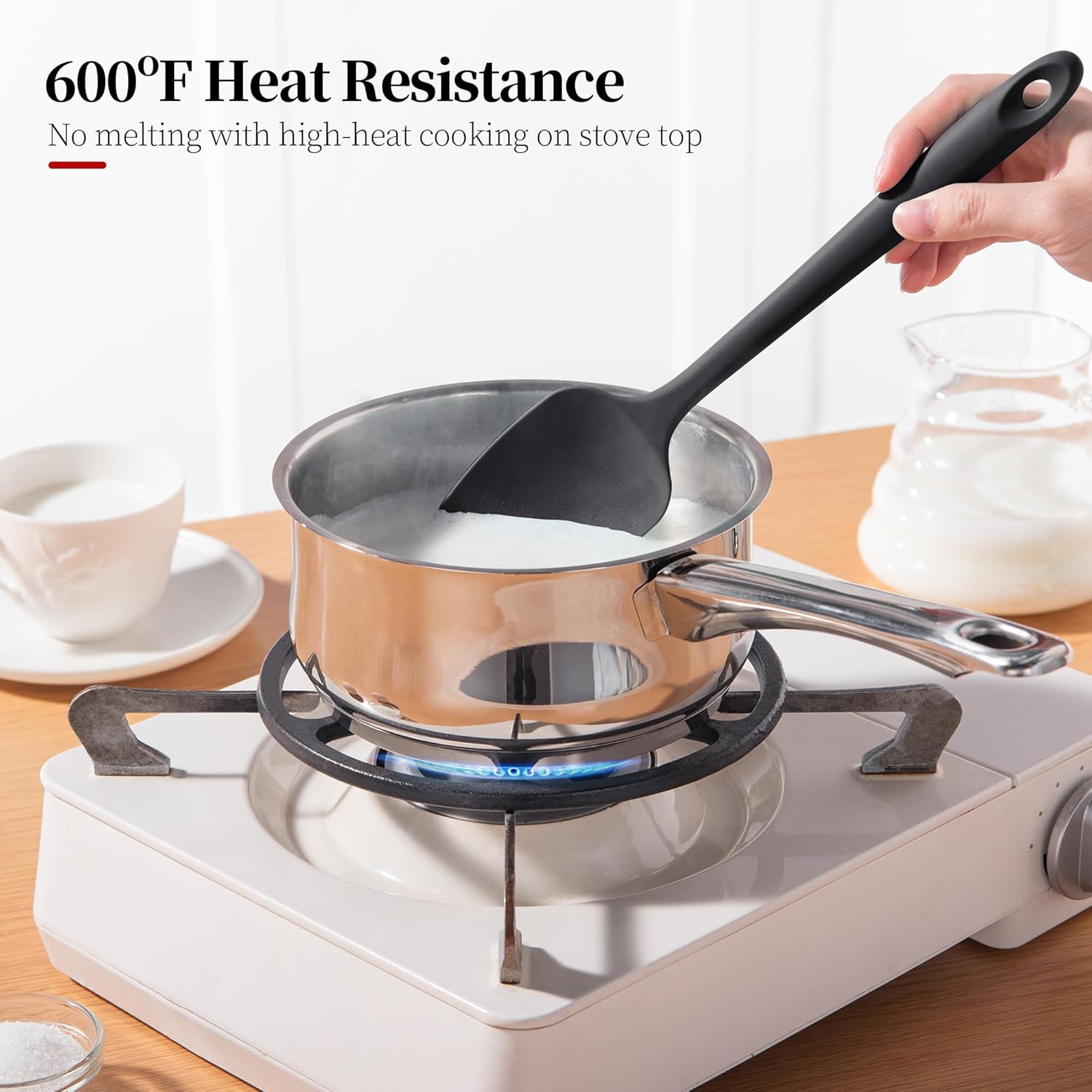 - Easy-to-hold & cool to the touch Our kitchen spatula has well-designed silicone handle featured with soft and non-slip grip. The handle won’t slip even in wet hands, and its ergonomic shape fits in your palm perfectly, serving you comfortable flexible gripping feeling when mixing, scraping, floding, or sautéing. The long handle of cooking spatula stays cool to the touch, allowing you to stir tomato soup, caramel, melted chocolate without the risk of burns in high-heat conditions.