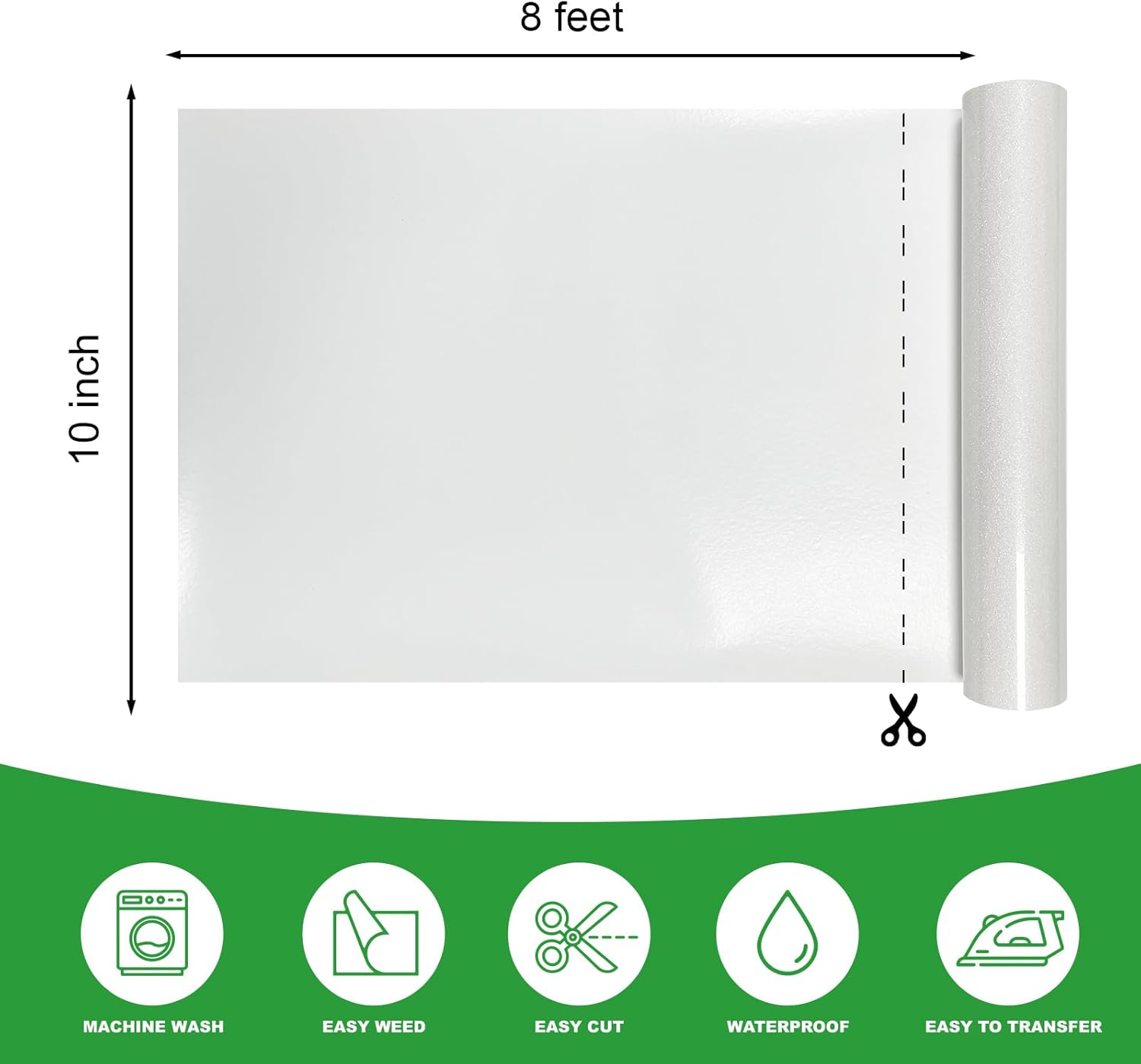 White Glitter HTV Heat Transfer Vinyl Rolls- 10" x 8ft. Glitter HTV White for Shirts. Iron on Vinyl and Heat Transfer Vinyl for All Cutters Machines. Easy to Cut & Weed Heat Vinyl Designs