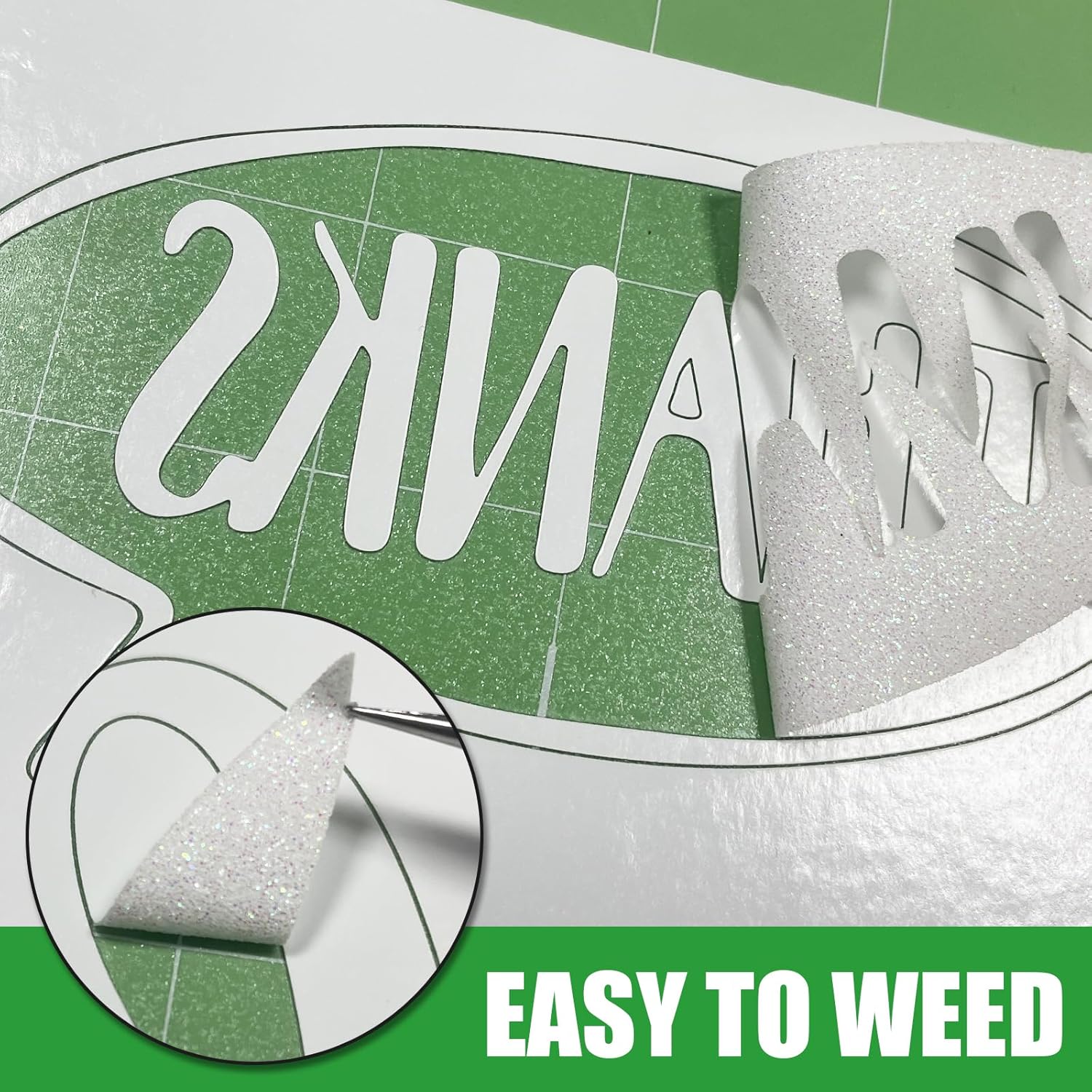 - 【EASY WEEDING AND CUTTING】Glitter HTV Vinyl for cutting and weeding, vinyl backing is sensitive to pressure and temperature and is easier to peel off once the design has been transferred to the desired surface. Glitter HTV Vinyl has excellent dimensional stability and very good characteristics for cutting applications