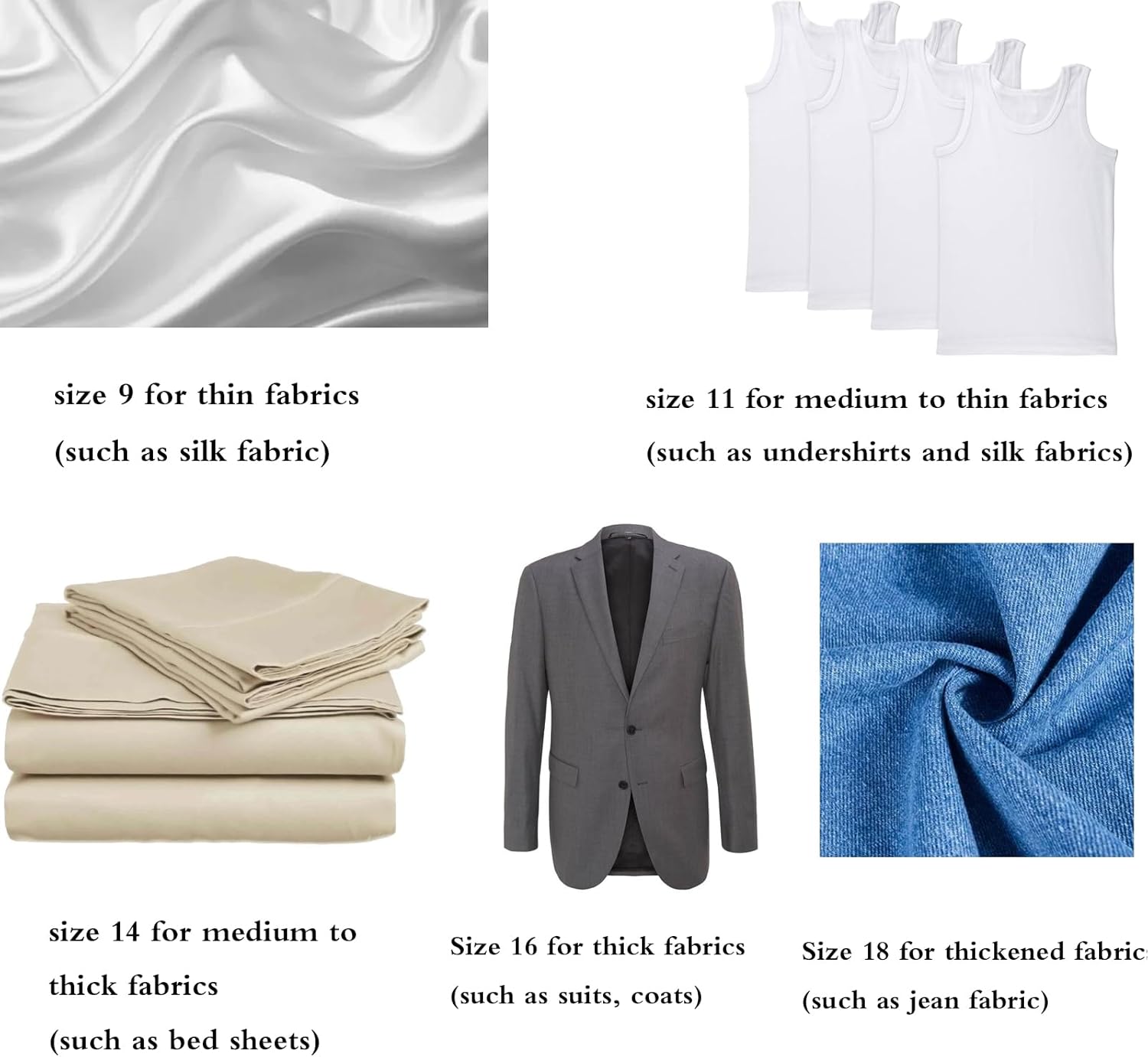 - Select the perfect needle size for your fabric type: Size 9 for thin fabrics (such as silk); Size 11 for medium to thin fabrics (such as undershirts and silk fabrics); Size 14 for medium to thick fabrics (such as shirts, bed sheets, curtains); Size 16 for thick fabrics (such as suits, coats); and Size 18 for thickened fabrics (such as jean fabric, cotton clothes)