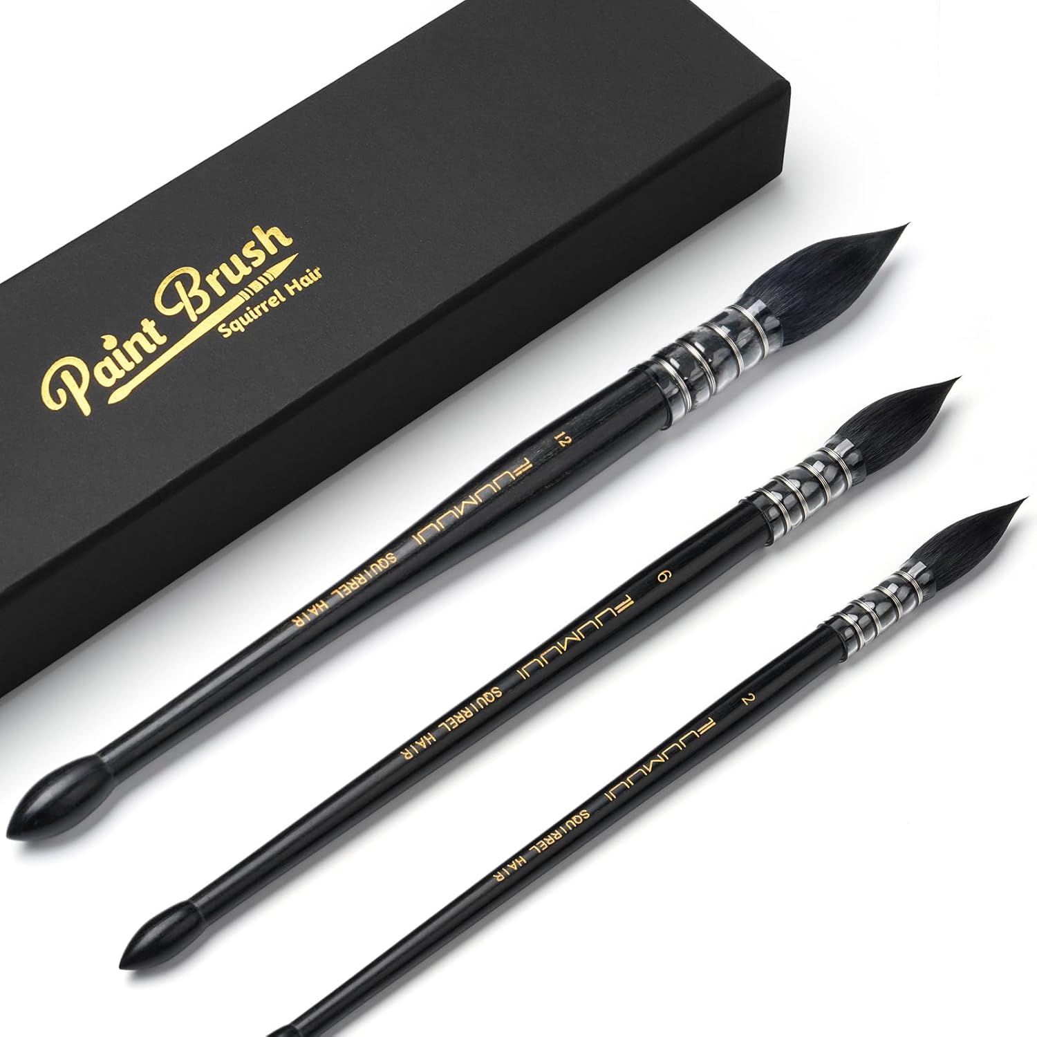 3PCS Squirrel Hair Watercolor Brushes, Fuumuui Professional Mop Round Quill Detail Fine Tip Watercolor Paint Brush Set for Water Color Gouache Ink Painting - Sizes #2, 6, 12
