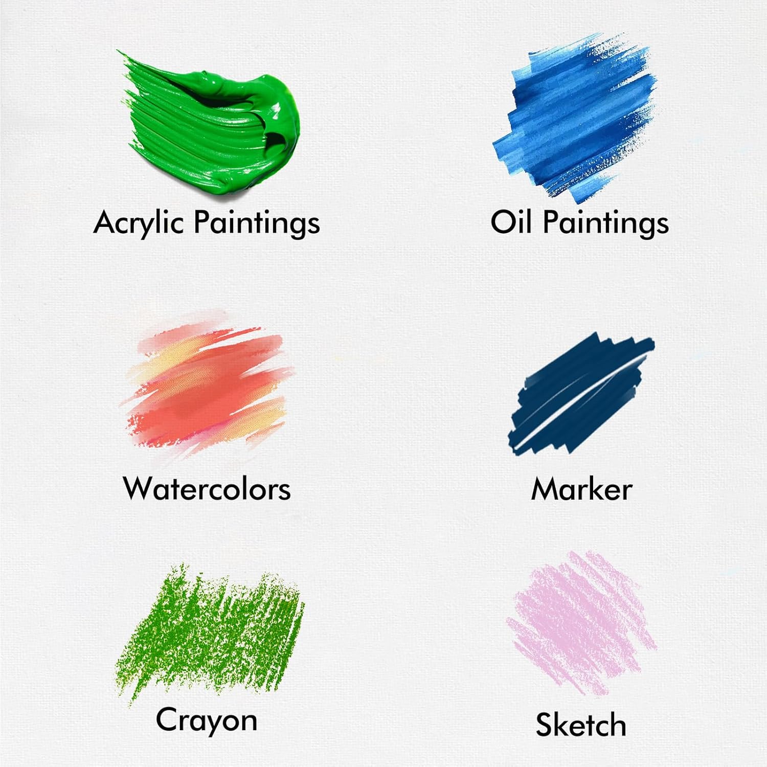 - 【Widely Used】Large and small canvases for painting suitable for oil painting,watercolors,acrylic paintings,tempera paintings,pouring,Gouache and Tempera,etc.. Paint canvas bulk are also suitable for various occasions such as teaching, gatherings, home decorations, birthday decorations, etc.