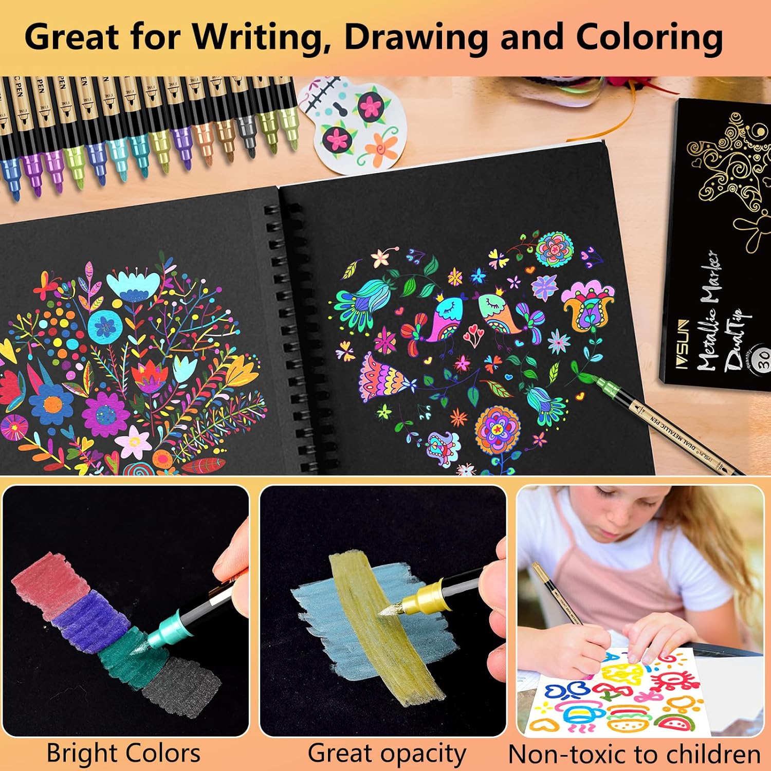 Metallic Marker Pens, 30 Colors Dual Tip Acrylic Paint Pens for Black Paper, Scrapbooking, Photo Album, Rock Painting, Paint Marker for DIY Arts & Crafts, Glass, Wood, Card Making, Scrapbook Supplies