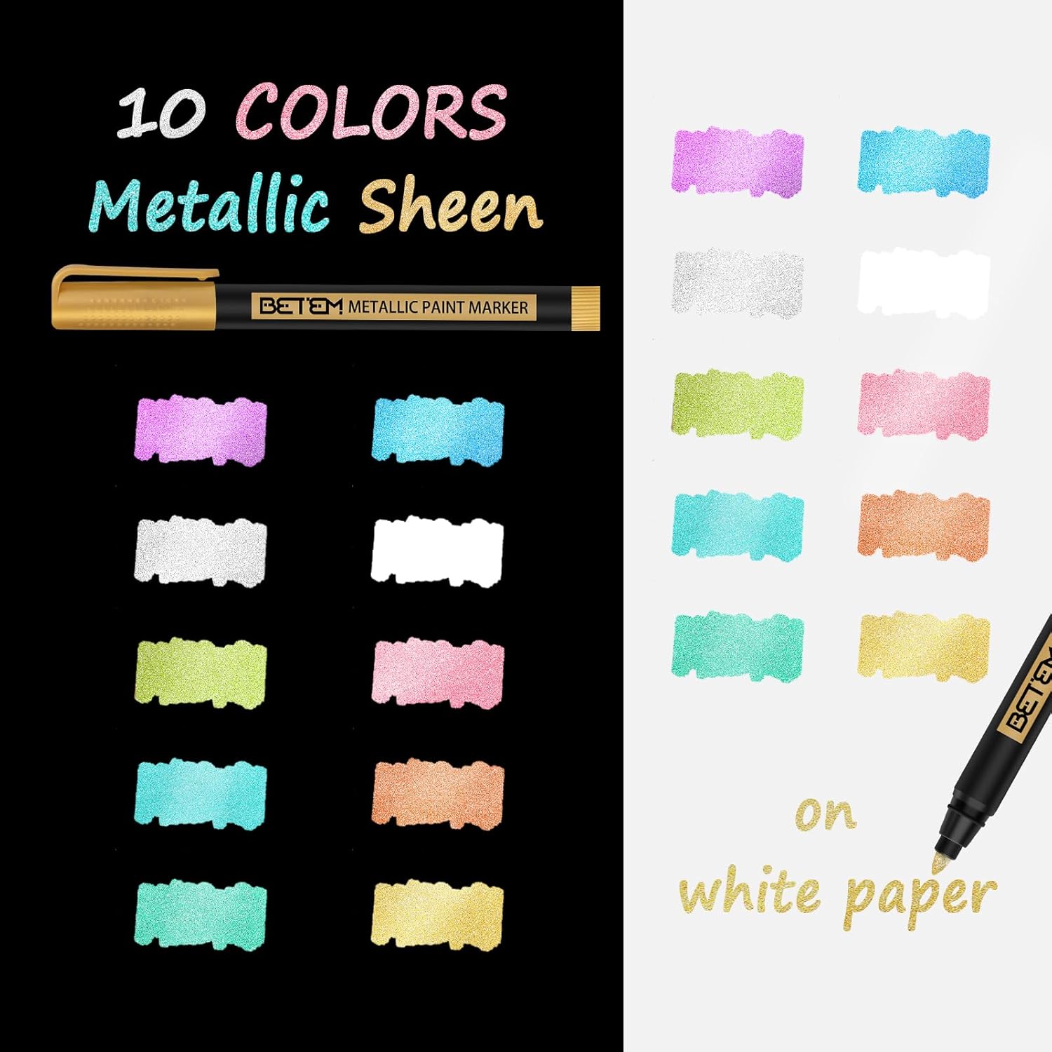 - 【Vibrant Metallic Colors】Betem metallic marker paint pen features 10 glossy metallic colors with soft shimmer, including silver, bronze, white, blue, purple, olive, red, cyan, orange and green. Highly pigmented metallic glitter paint pens for creating a sparkling glitter finish on various craft projects. Acrylic paint markers for black paper with amazing and vivid effects.